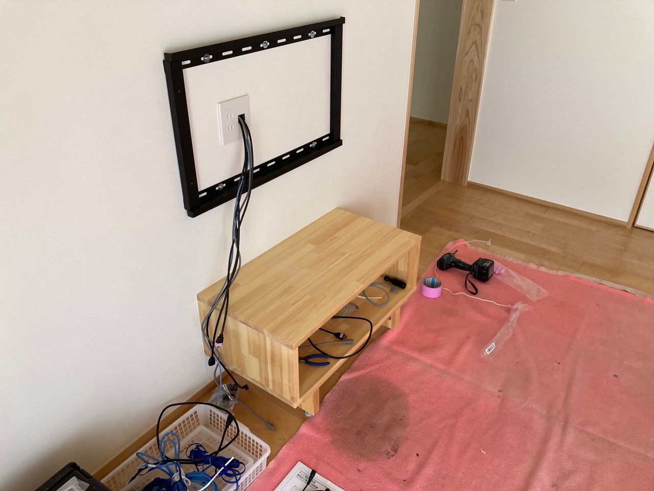 壁掛けテレビを取付けにうかがいました。壁の下地に対しビスで留め付ける、という作業まではそんなに難しい話ではありませんが、壁の中に機器用の配線を通すという作業に一苦労です。想定では3本ほど通せばよいかと考えてその太さの空配管をしておきましたが、最近の機器はやはりHDMIの配線が各々に必要であり、ネットテレビを見るためにLANも必要との事で全部で5本の線を根性で通しました。昔みたいに映像と音声で赤白黄の3つのプラグでないだけまだマシですが。