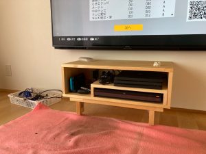取り付けた機器を確認中、やはり最新のハイテク機器はメカ音痴な筆者にとってはチンプンカンプンです。事前にテレビ下に収納したい機器の品番を教えてもらって寸法を調べ、キッチリとしたサイズでつくる事で配線も表に現れずすっきりとした造りとする事ができました。