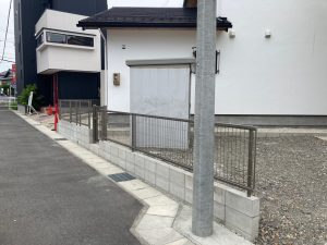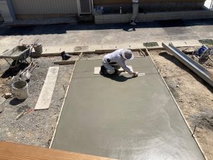 外構工事の最後のコンクリート打設を終えました。土地の形状からか空き地であった時分には大雨が降ると手前の道路側溝に土が流れ込み、現在ではほとんど詰まってしまっています。i様が町役場に相談したところ土撤去工事を町で行ってくれるという事でしたので、浄化槽の排水も流れていくので一安心です。コンクリートを打ってしまったのでこれからは土が流れていく事はありません。