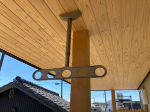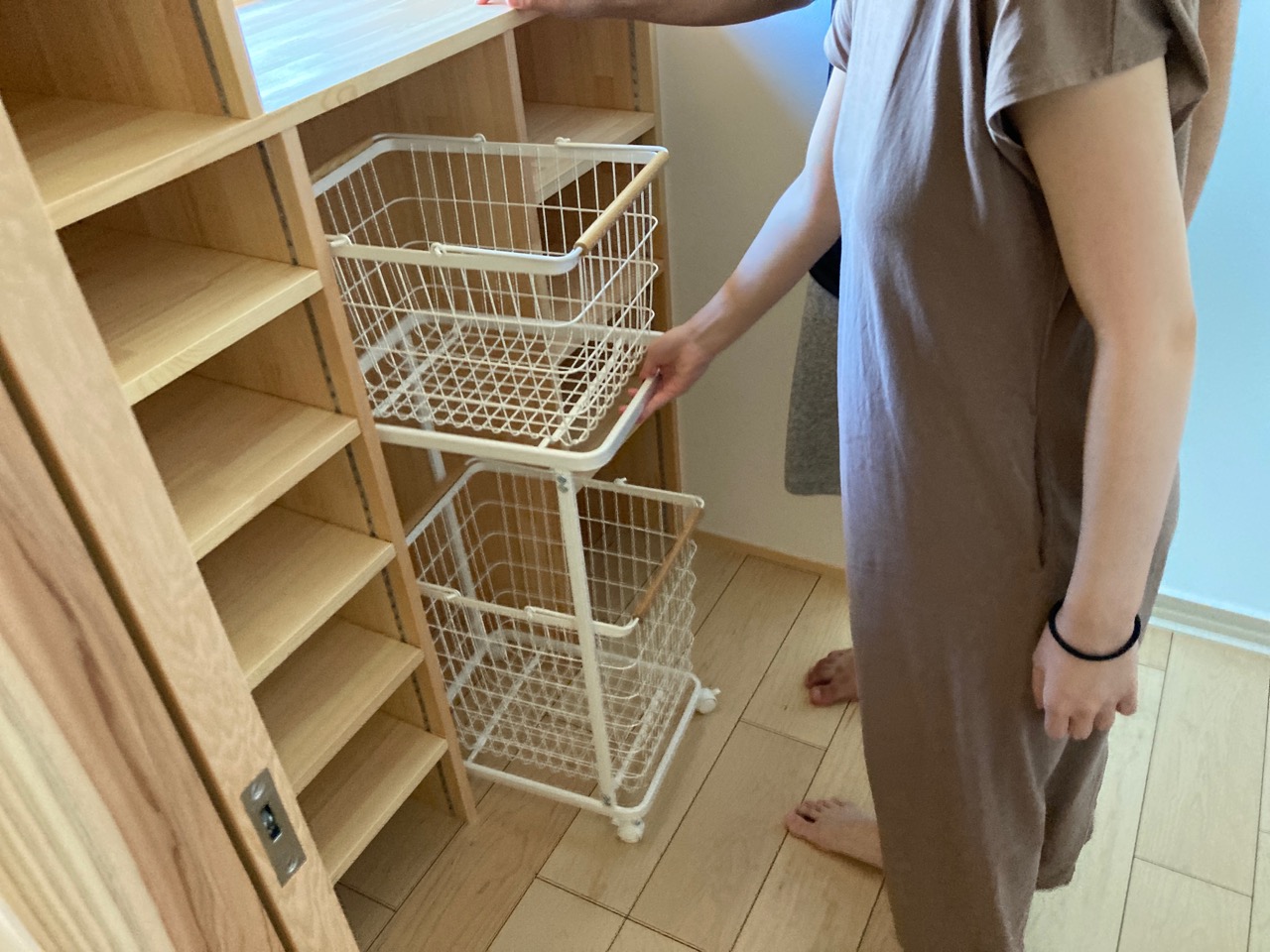 洗濯物物干金物や洗濯カゴを設置。工事中に行った下地位置の確認や、設置したい物の寸法のお打合せが役に立った瞬間です。