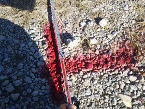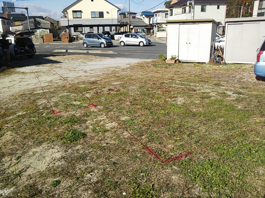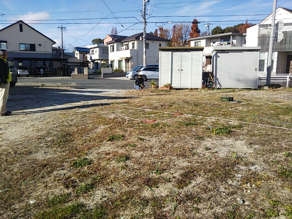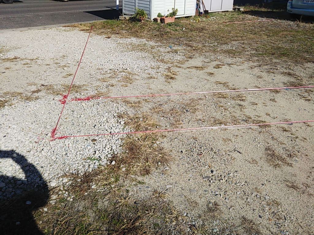 ただいま鋭意建築確認申請中。同時並行で長期優良住宅申請中。その間に地盤調査を行うべく、敷地に建物の位置出しにやってきました。建物は割と整形なのですが敷地が変形の五角形をしているため、調査会社がどのあたりを調査して良いのか分かりにくいので、配置図を元に現地で位置出しをしておきます。
