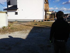 その後は現場に移動。建物の正確な位置出しを行い確認します。比較的敷地形状が変形のため、図面で見ているのと実際に現場で位置を出してみるのとだいぶ感覚的には違います。