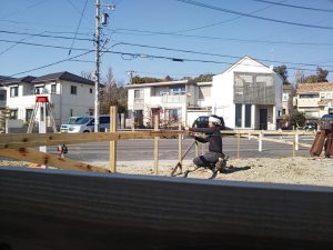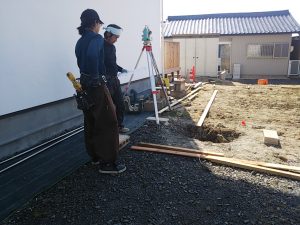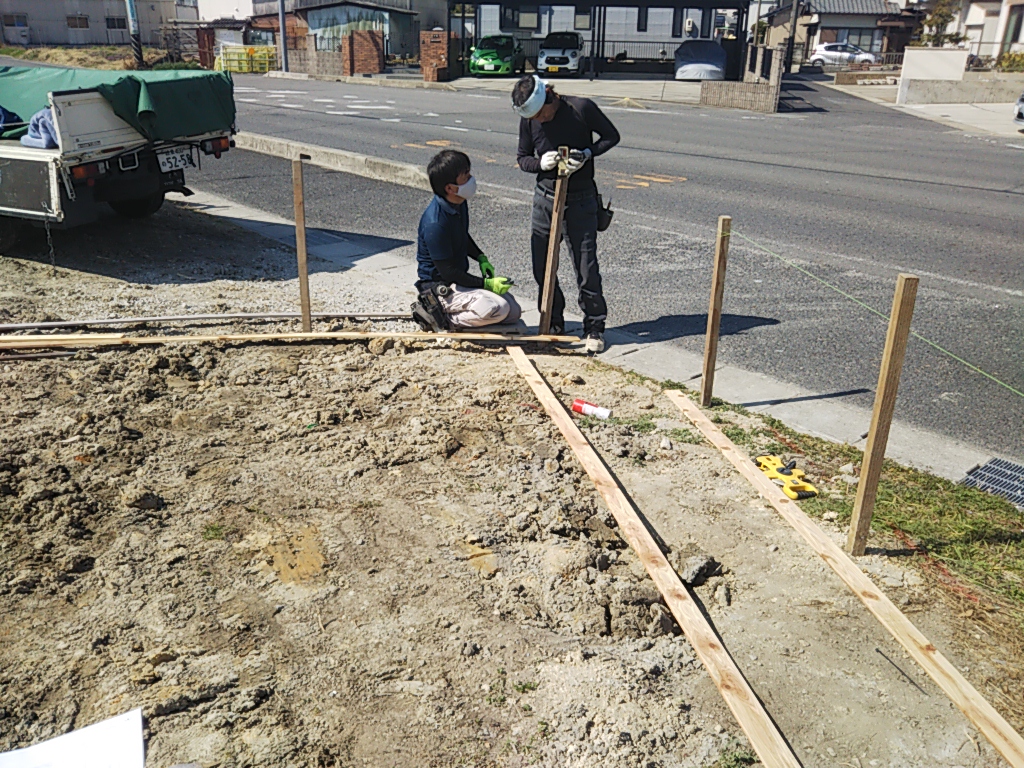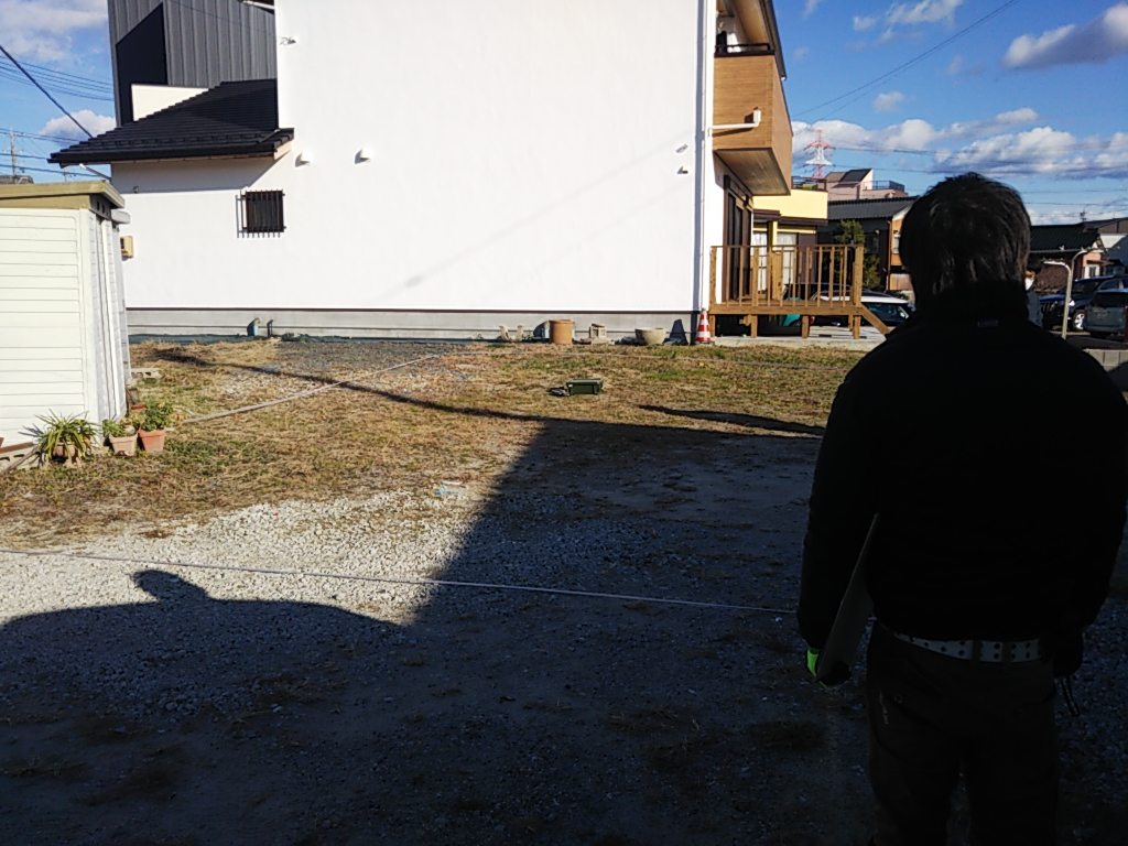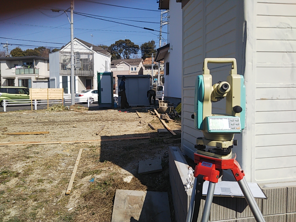 基礎工事の丁張りを行いました。本日は最高気温22℃の予報。まだ3月にもなっていないというのにこの暑さ。作業をしている職人さんは涼しい顔ですが、トランシットを見ているだけの筆者はすでに汗だく、Tシャツでの測定となりました。