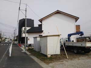 現状の物置が置いてある部分に計画建物の配置が重なっている、という事もありますが今回の計画建築物の敷地内に物置があると少し面倒な事がありました。