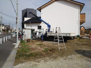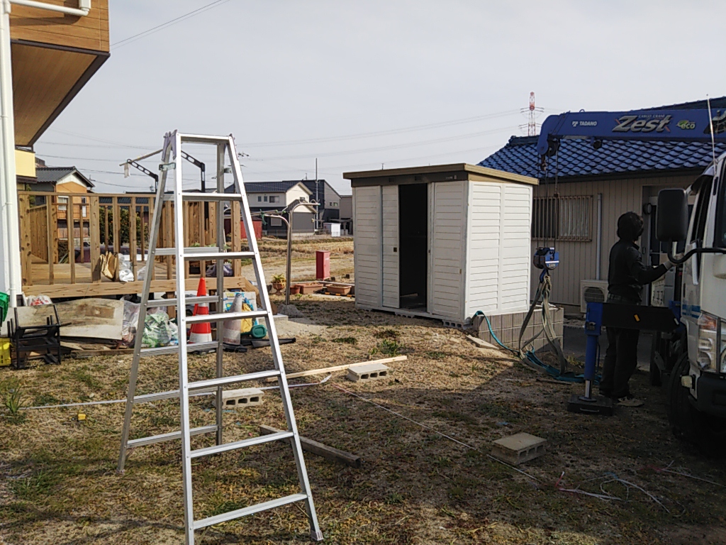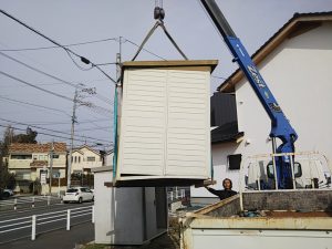 工事に先立ちスチール物置の移動にやってきました。基礎部隊のtさんにユニック車で吊り上げて移動してもらいます。