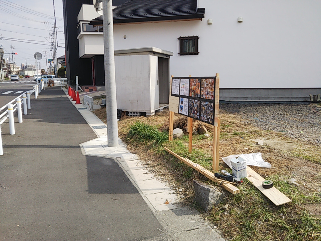 今回の看板は歩道付きの大通りに面して建てる事ができ、交差点も近いので多くの人の目に留まるという立地条件です。見かけた方はぜひご一読をお願いします。