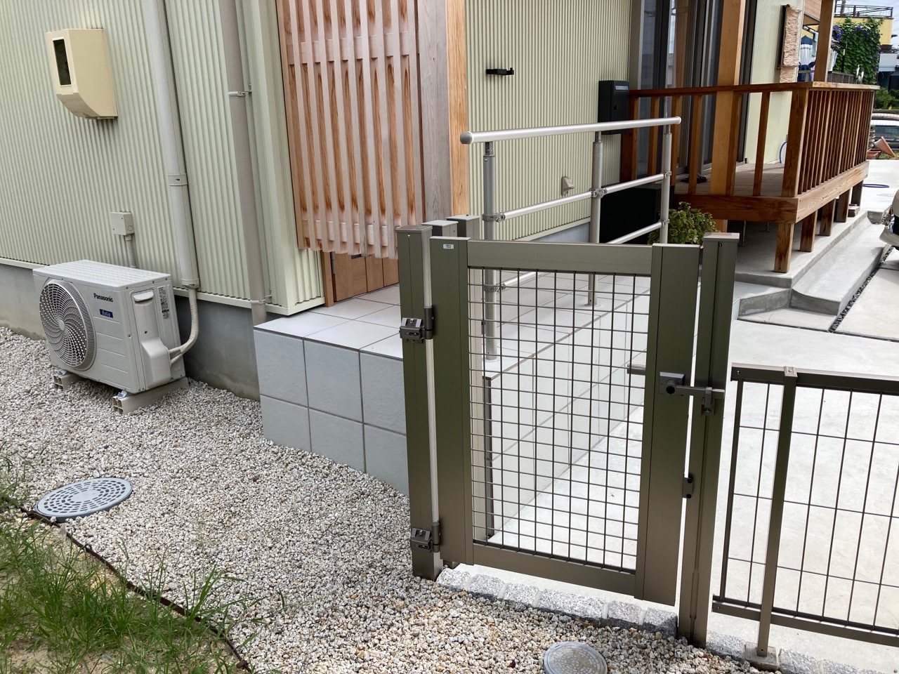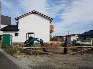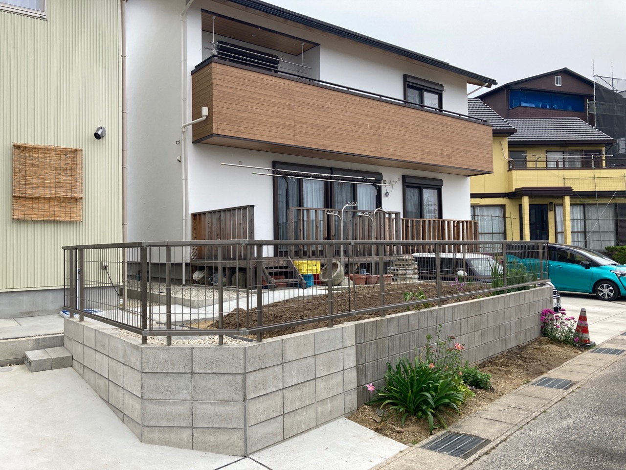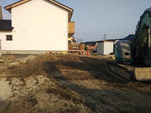 東側の本宅とのつながりのある外構工事施行中です。道路との高低差をどのように処理するかが肝要になってきます。mi様邸の菜園もしっかりと残した配置となっています。一時期置いてあった物置は別の場所に移動されました。