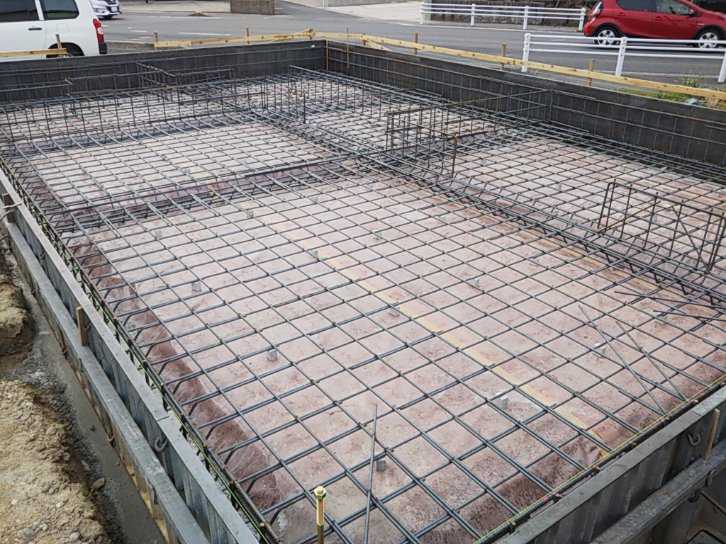 現場では本日は配筋検査を行いました。ミノワでは基礎断熱工法を行います。(基礎コンクリートの垂直部分に外周部に沿って断熱材を充てる工法)そのため屋内の床下部分はできるだけ間仕切なく通気が良いようにしておきたいのですが、コンクリートの底板の強度を考えると、間仕切りを減らすのも考えもの。間仕切りはイコールコンクリートの梁となり、地反力に対して住宅を支えるために必要です。これら相反する要素を両方満たすため、地中梁を入れる工法を取っています。左写真で基礎底板を六分割しているラインが地中梁部分です。これにより底板を支え、かつ、床下をできるだけ空気環境的に一体空間としているのです。