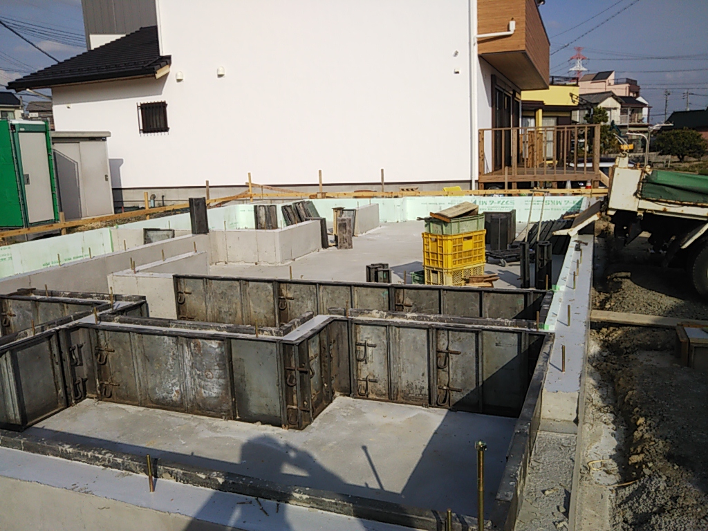 基礎の型枠存置養生期間を終え、型枠を外しにかかりました。表面はツヤツヤで良い感じに打設できています。まだ春先とは言えすでに20℃近い暑さの中、重い鋼製型枠を取り扱うのは非常に骨の折れる作業と思いますが、頑張ってもらっています。あまり考えたくはありませんが、真夏ともなるとコンクリート仕事はまさに灼熱地獄となります。