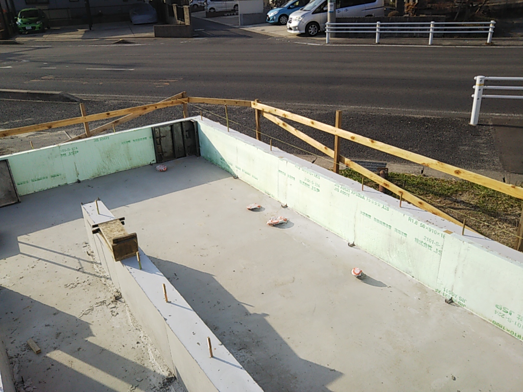 基礎の内周部には型枠を建てる時に同時に仕込んでおいた基礎断熱材が張り付いています。コンクリートの接着性能により、基礎とピッタリと貼りつき、床下の断熱性能を高めます。