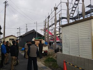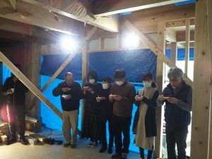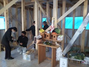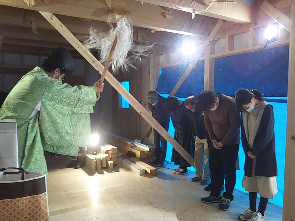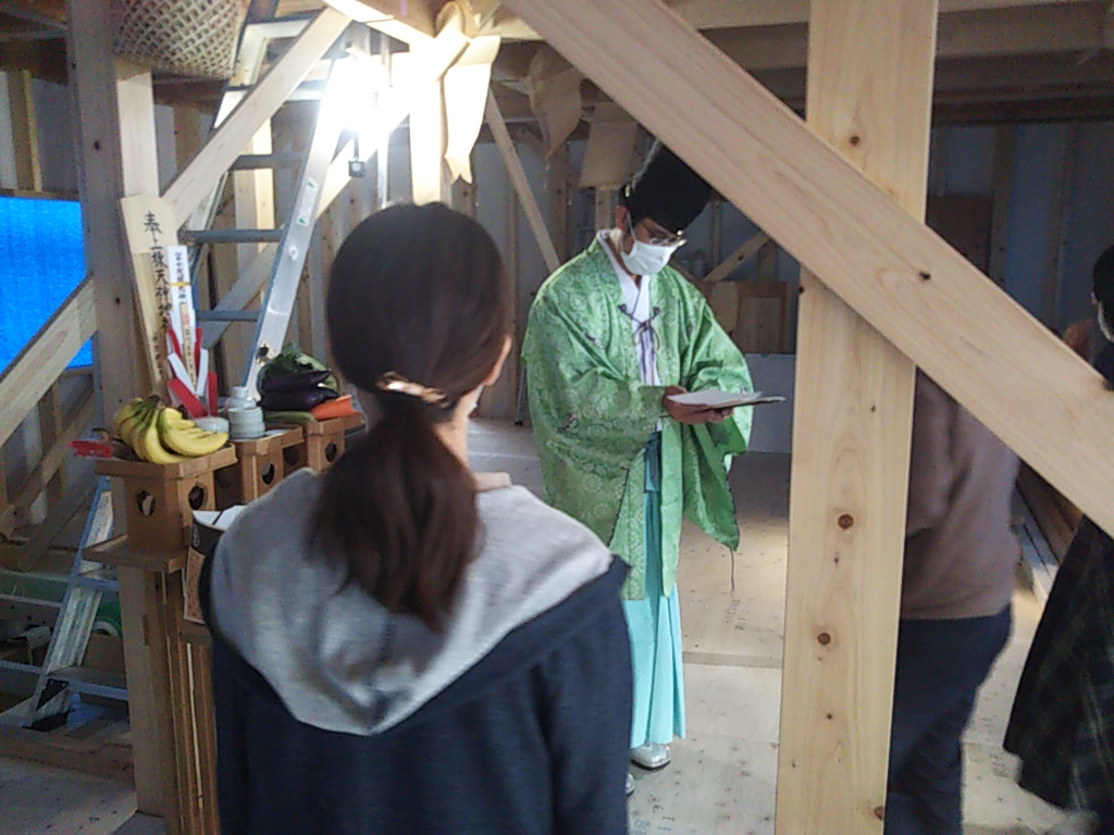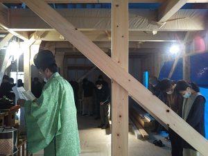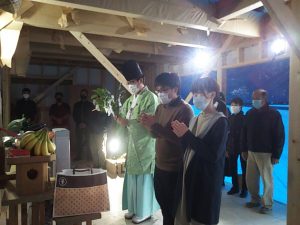 お祓いや祝詞奏上をつつがなく進行。あらん限りの声量で祝詞を奏上するという流派(?)の方のためか、建物内には神主さんの大音声が響き渡ります。地鎮祭の時はまだ外部でしたのでそこまでは感じませんでしたが、上棟式になるとその違いがよくわかります。