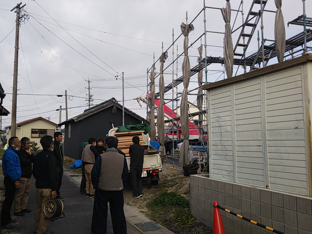 天気予報では雨天が心配されましたが、日が近づくにつれだんだんと降水確率が減っていき、雨の心配もなくなって無事上棟の日を迎えました。早朝、作業前のひと時、世間話をしながらも棟梁集団の目は徐々に光と鋭さを帯びてきます。談笑はしているものの目が笑っていない。上棟作業が始まってしまえばゴミ拾いに没頭するくらいしかない筆者は作業中よりもむしろこの朝のひと時、大工集団に囲まれている時の方が緊張します。