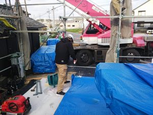 翌日が雨天の予報のため、外周をブルーシートで覆います。写真では分かりづらいですが、現場の中は青一色に染まっています。これで雨対策はばっちりです。