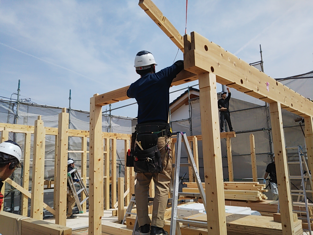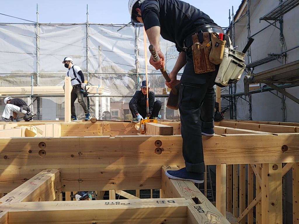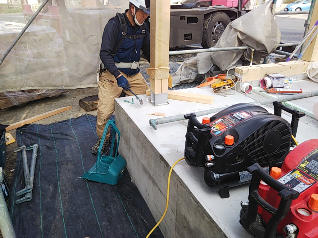 柱建て作業からスタート。柱には番付という印が印字されており、東西の何本目、南北の何本目、向きが分かるようになっています。あらかじめ工場でプレカットされた土台のホゾ穴に差し込んでいきます。