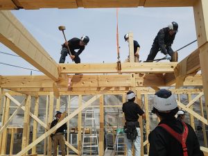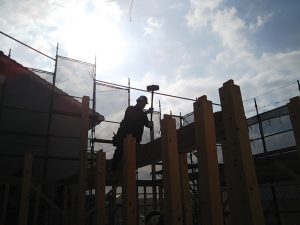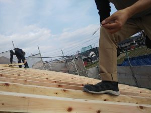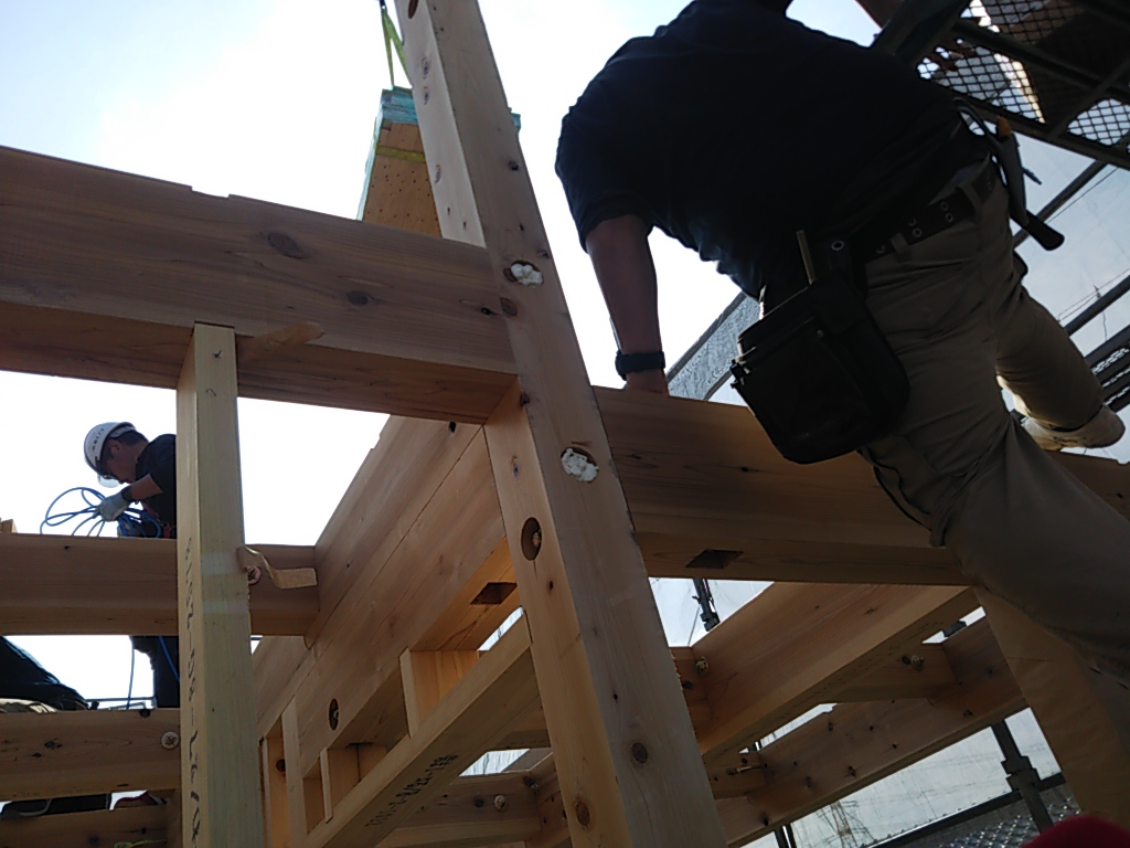主として上部に上がるのはできるだけ若手の大工さん。棟梁やベテラン大工はデンと構え下から的確に指示と檄を飛ばします。