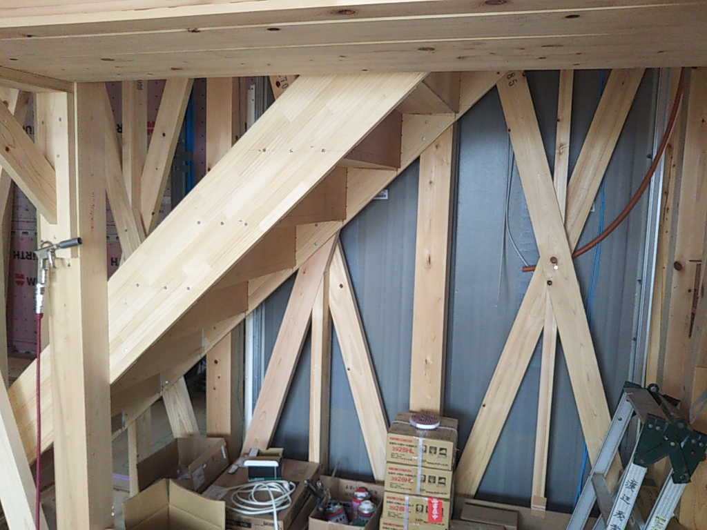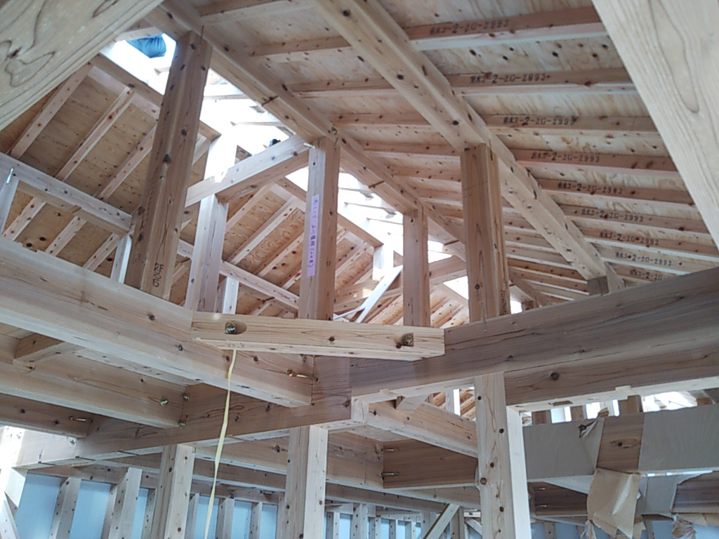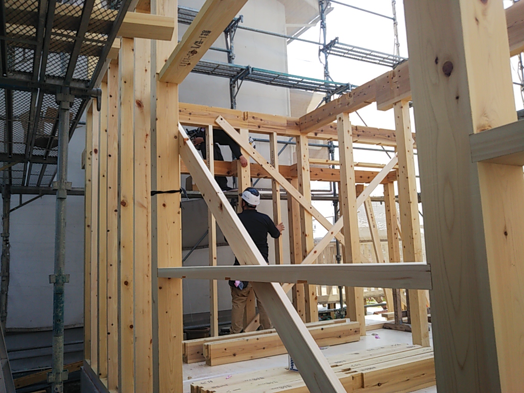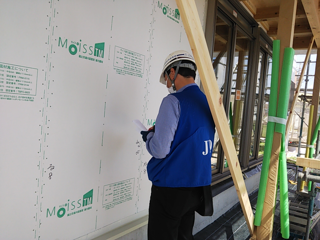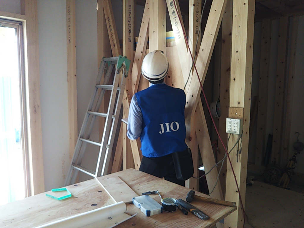 本日はJIOの中間検査を受けました。建築金物や面材に打たれる釘などを細かくチェック。質問を受けるたびに冷や汗ものでしたが、打ち忘れ部分などは即座に棟梁に対応してもらい、無事に合格しました。