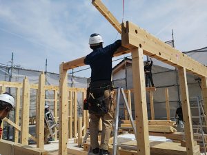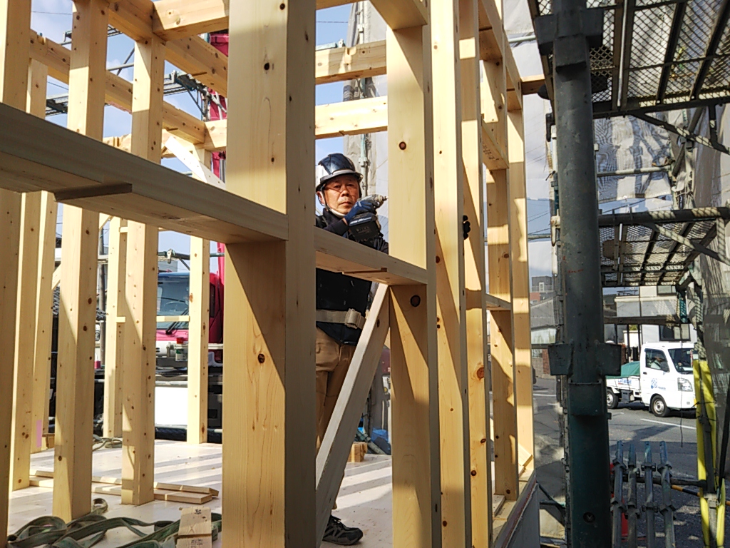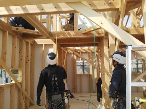 構造用の柱、梁を組み上げていく作業と並行して、窓枠、間柱などの『羽柄材』(構造材ではありませんが、開口部や内装下地の下地となる材料)も手際よく据え付けられていきます。これらもプレカット工場で事前に加工して現場に搬入されるので、作業もスムーズです。