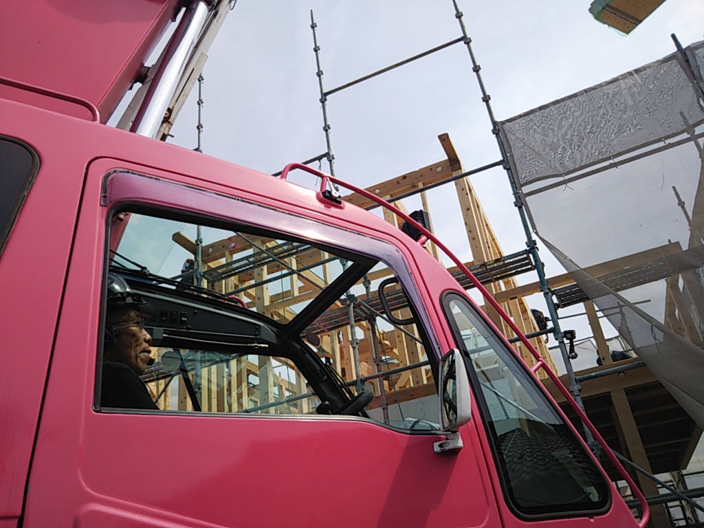 建物がだんだんと組みあがってくると、レッカーの運転席からは角度的に奥の方の状況が見えなくなってきます。そこで運転手さんと棟梁の一人がイヤホンマイクのヘッドセットを装着。上部にいる棟梁からの指示が飛び、それに合わせて熟練の運転手さんが息の合った操作を行います。
