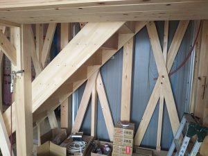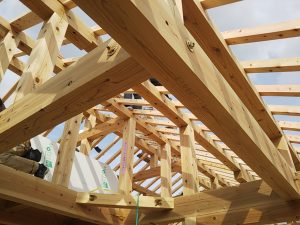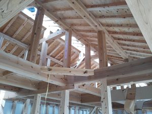 小屋裏にも2階床と同様、水平剛性を高めるための構造用合板を敷き詰めます。と言っても、小屋裏は左写真の部分のみ。その他の場所には『火打梁』を使用しました。2階は屋根勾配に合わせた勾配天井とし、化粧梁を見せるためそもそも水平面が打てない、という理由もあります。合板が敷いてある部分は小屋裏収納になる予定です。