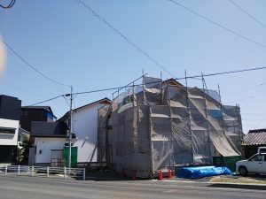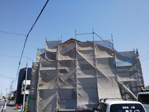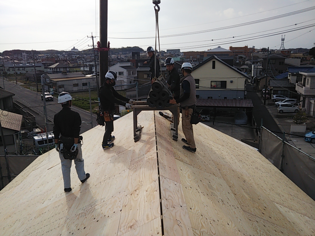 別の現場で忙しい中、なかなかi様邸に来れませんでしたが、上棟以来ぶりに来てみると屋根瓦工事がそろそろ終わる頃でした。しかしやはり通りからよく目立つ立地です。道行く人も信号待ちの人も興味深く見ていきます。