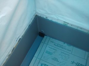 昨日下地を造作中であったバルコニーは防水下地の形が出来上がり、手摺天端にも防水シートが掛けられています。(写真の黒いシート)直線部分は比較的形状も簡単ですので掛けて織り込むだけで済みますが、手摺の付け根(外壁との取り合い部分)は掛け方が複雑です。そんな部分を確実に防水するために、最初から取り合い部分の形をした樹脂製のシートを使用ています。便利な商品があるものです。