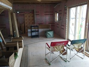 2階部分の外壁耐力面材も張られ、住宅の形が徐々に見え始めた頃、別件で現場を離れていた監督s水も到着。これで役者が揃いましたな。