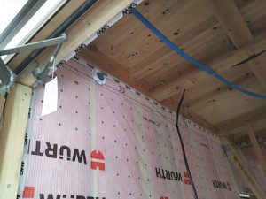 小屋組みができてきたところで屋根下地の垂木を取付けていきます。垂木は一か所ずつ長いビスで留め付けていきます。固定する、という目的はもちろん、性能保証の仕様的には暴風時に軒先の浮き上がりを防止する性能を持ったビスの仕様が求められます。