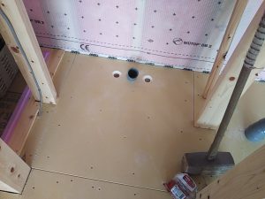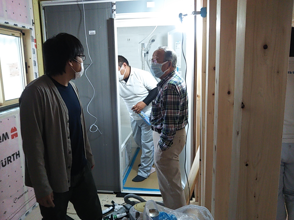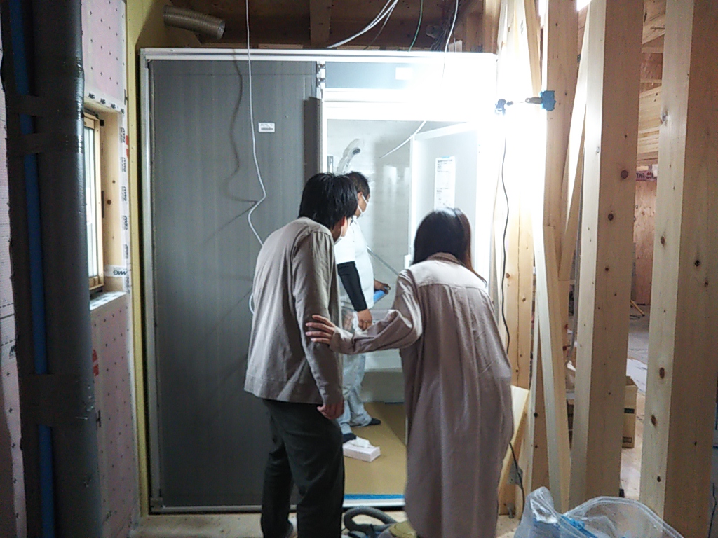 設備の色決めに再度ショールームへやってきました。いよいよ上棟も近づいてきていますが、上棟後一番最初に施工される設備機器はユニットバスになります。外壁面の断熱、法定の防火の処置が終われば箱型状のユニットバスを先に据え、その周りを棟梁に造作してもらっていきます。