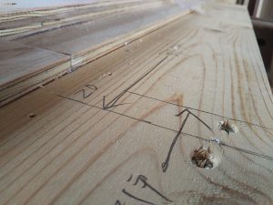 ※縦勝ち、横勝ち:四角形の部品を組む際にどちらの材料を伸ばして組んでいくかという時に使う用語です。伸ばした方を『勝ち』、伸ばしていない方を『負け』(あまり負けという表現は使いませんが)として認識しています。板は各々角をわずかに面を取る(角にカンナを掛けて鈍角にしておく→手に触れる部分ですので切れないようにしておく)ので負け方向の板を勝ち方向の板より約1~3㎜小さくつくっておき、接合部のちらつきが無いようにしておきます。現場用語で『面落ち』と呼んでいます。