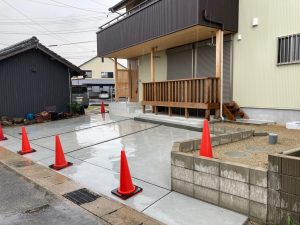 あいにくの雨天ですが土間コンクリートを打設し終えた外観を見る事ができました。コンクリート間に数本入れられたスリットにこの後砕石を詰めて完了の見通しです。コンクリートの間にわざと溝をつくっているのは見た目デザインのためだけではありません。コンクリートは乾燥していくに従い収縮し、割れを起す場合があります。その収縮度合いを緩和させるため、伸縮目地代わりにスリットを入れているのです。その部分に地被植物としてタマリュウや芝を植えたりして無味乾燥なコンクリートにワンポイントを入れる、という方法もあります。