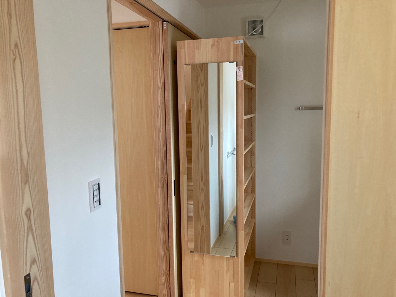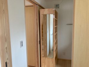 洗面洗濯室に姿見のミラーを取付けました。朝などは左側に写っているクローゼットから上着を取り出し、ここで身づくろいできます。偶然ですがなかなか良い場所に棚があったものだ、とこの場所に取付ける事になりました。