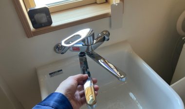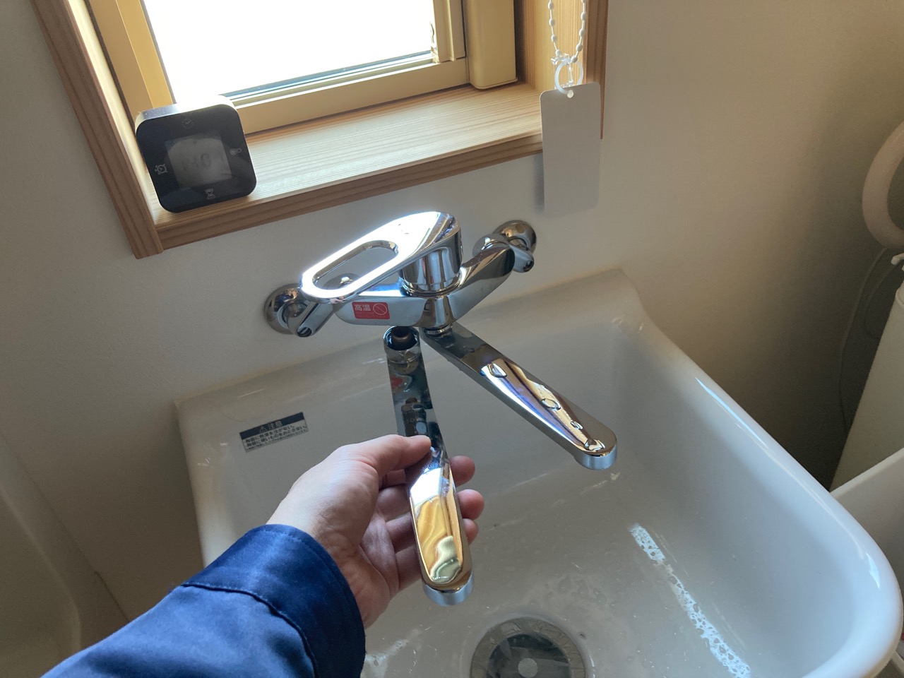 混合水栓の吐水口の交換工事。最初の吐水口の長さが少々長すぎて使いづらかったようです。メーカーにはそれより5㎝ほど短い吐水口もありましたので交換して使いやすい長さとしました。こういう時にモンキレンチなど道具を持っていると便利です。