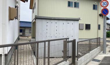 建築基準法第2条第1号では『建築物』の定義として『土地に定着する工作物のうち,屋根及び柱若しくは壁を有するもの』とあります。・・・???なにか問題でも? と思われるかもしれません。実はこのスチール物置も『土地に定着する建築物』とみなされ、同一敷地内にある建築物として建築面積や床面積に算入されてしまうのです。(どう見ても定着はしていないのですが)建蔽率や容積率に余裕があれば別に移動する必要はありませんが、制限ギリギリのような現場は仮設とは言えこのような物置の面積が命取りになる事もあります。 簡単に移動できるのに『建築物』とはねぇ・・・