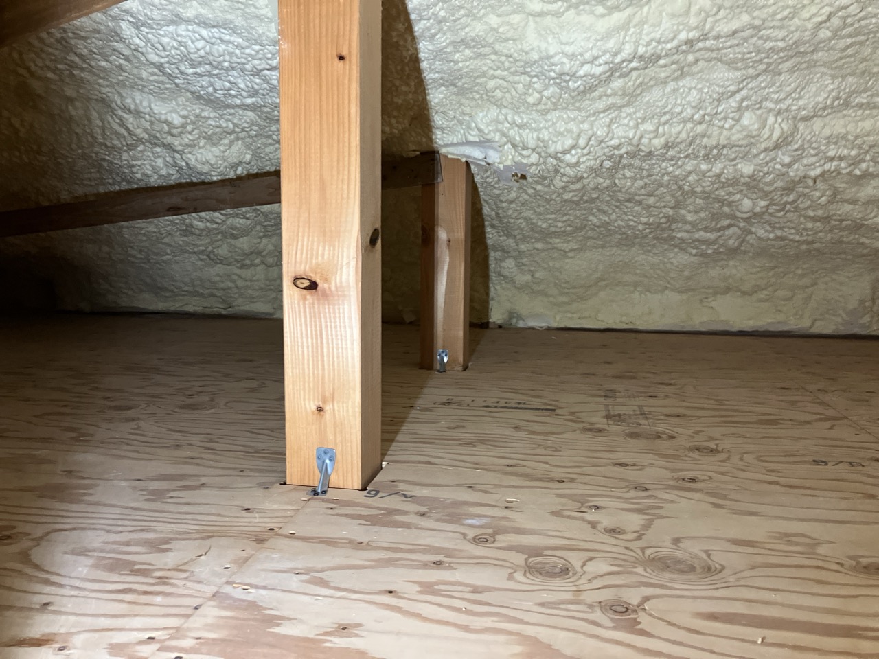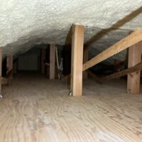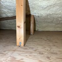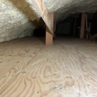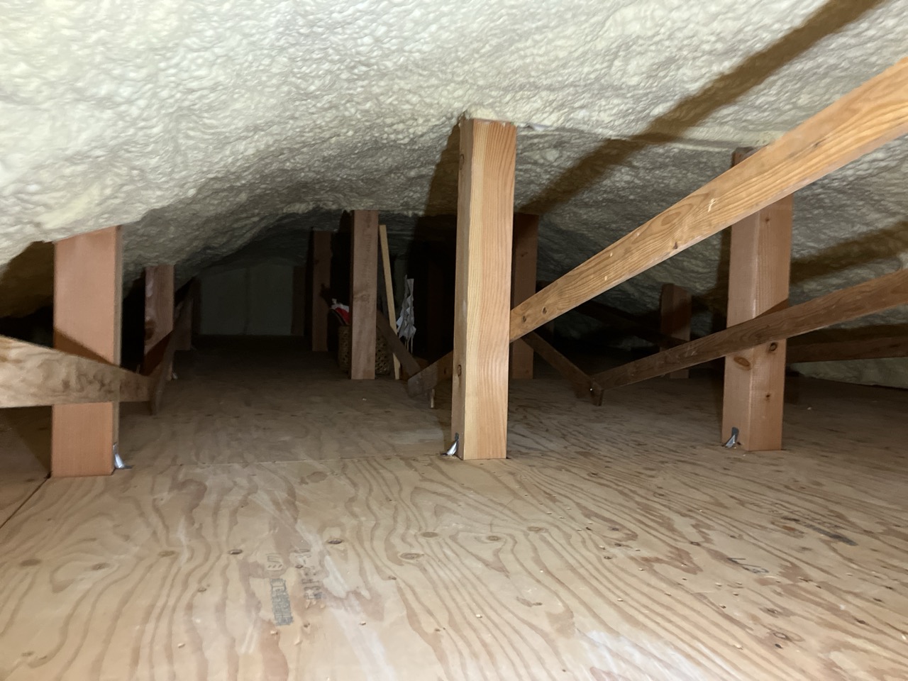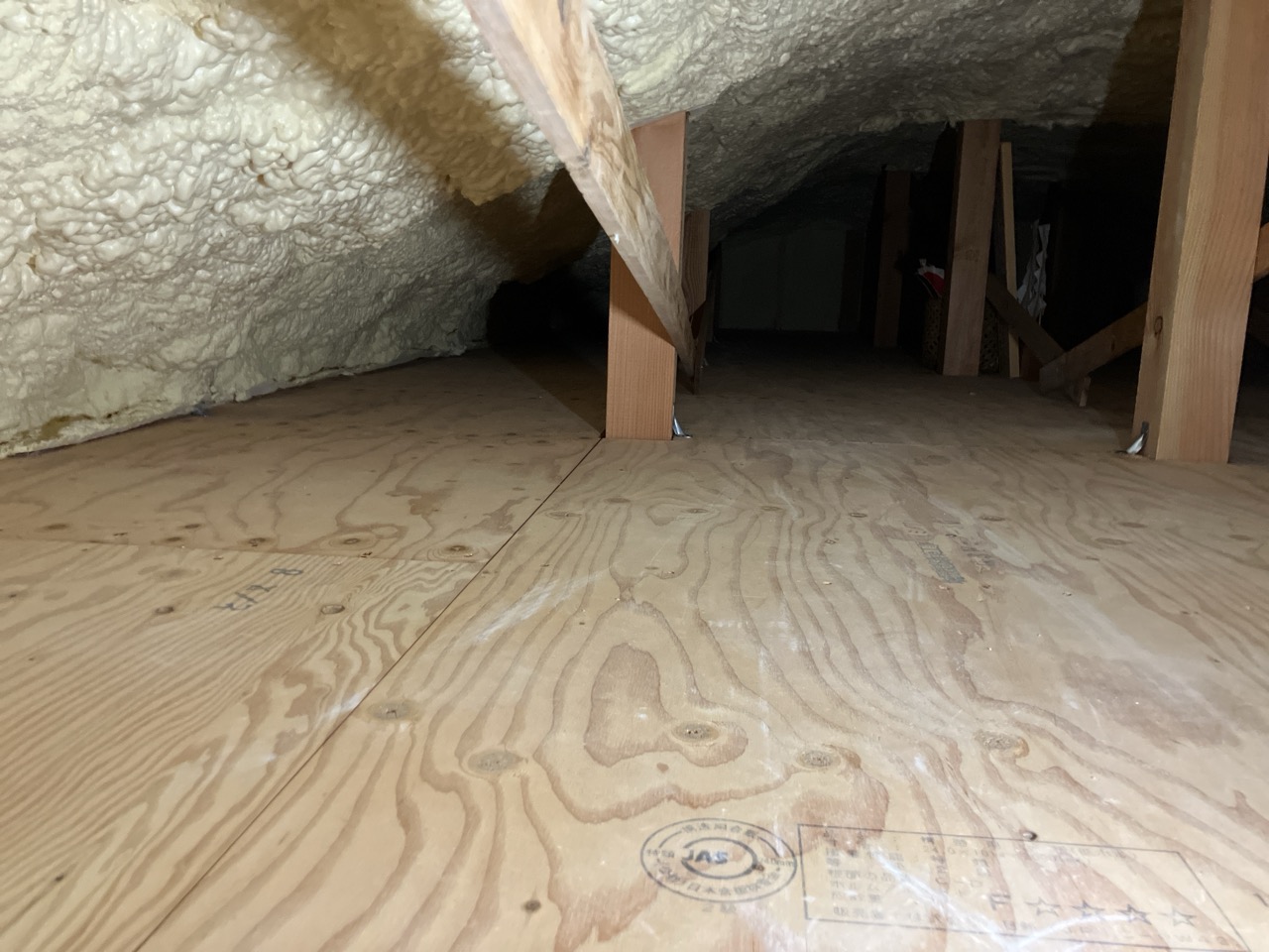 小屋裏チェック。当時発泡ウレタンの吹き付け断熱を使用していました。そして小屋裏の水平後面は根太掘り込みプラス12㎜の合板を使用するか、3尺ピッチの梁プラス24㎜合板を使用するか試行錯誤をしていた時期だと記憶がよみがえってきました。