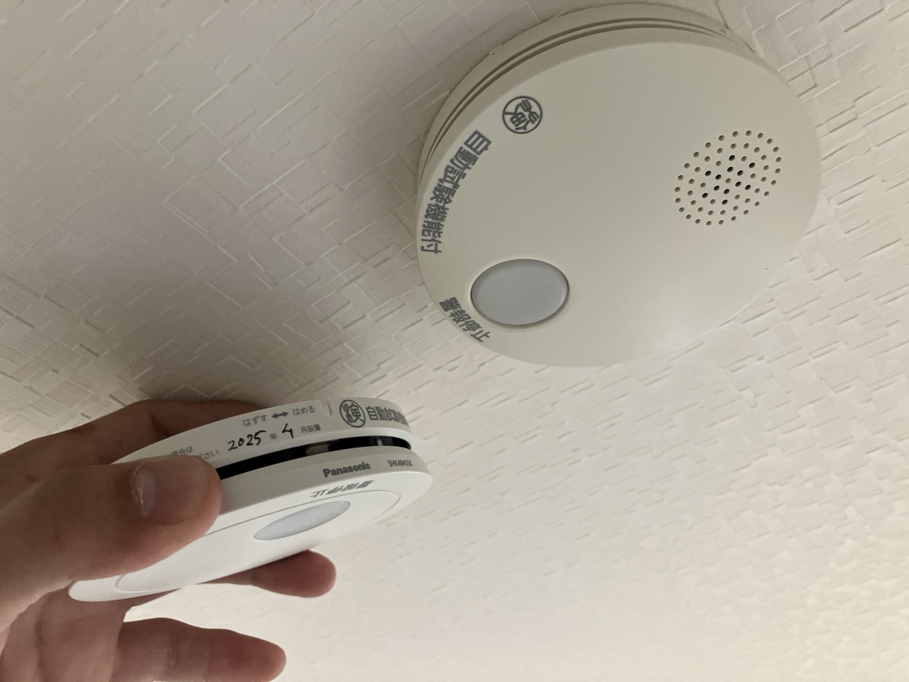 10年前に筆者自身が取り付けた火災報知器と新しい火災報知器を交換。だいたい10年くらいで電池の寿命がきて、電池切れの際にはブザーが鳴ってお知らせしてくれます。先日の点検の際に2階の一室で電池切れブザーが鳴って、取り外したそうです。10年前と形が変わっていないので取り換え自体は非常に手間いらずです。