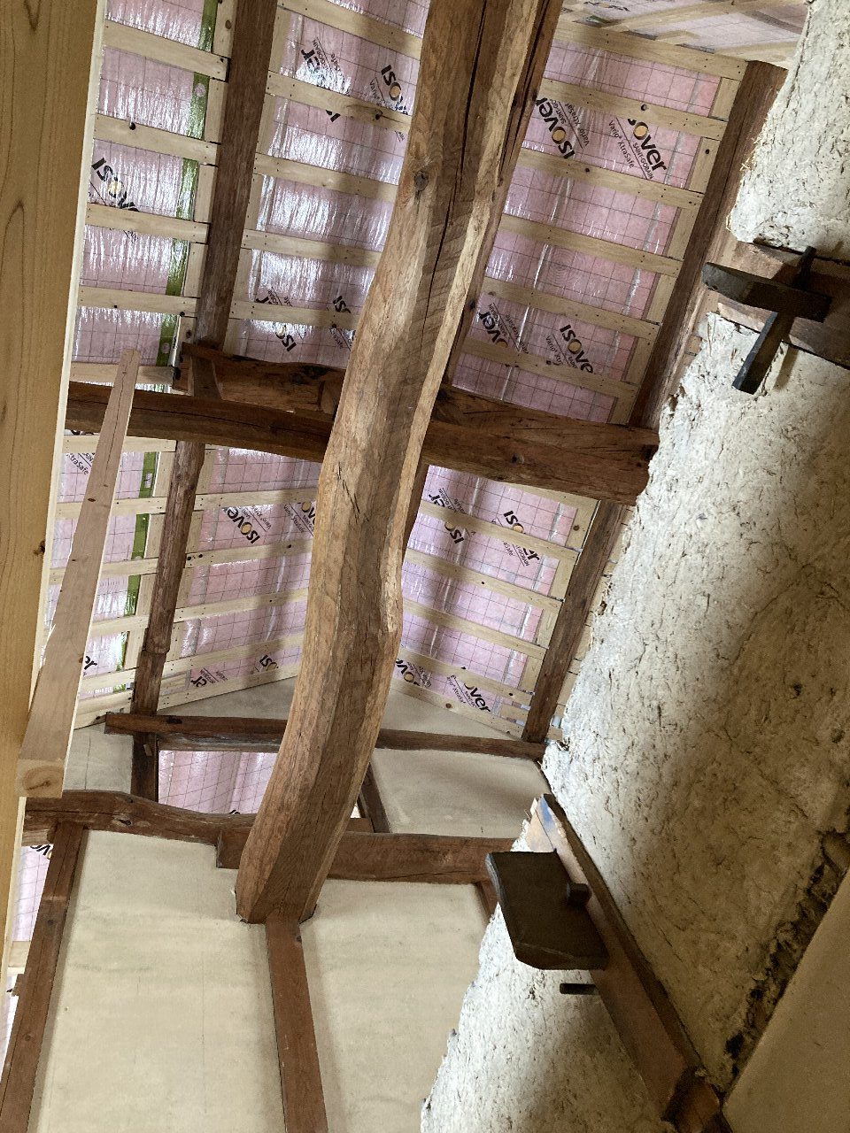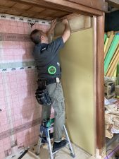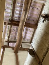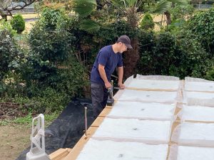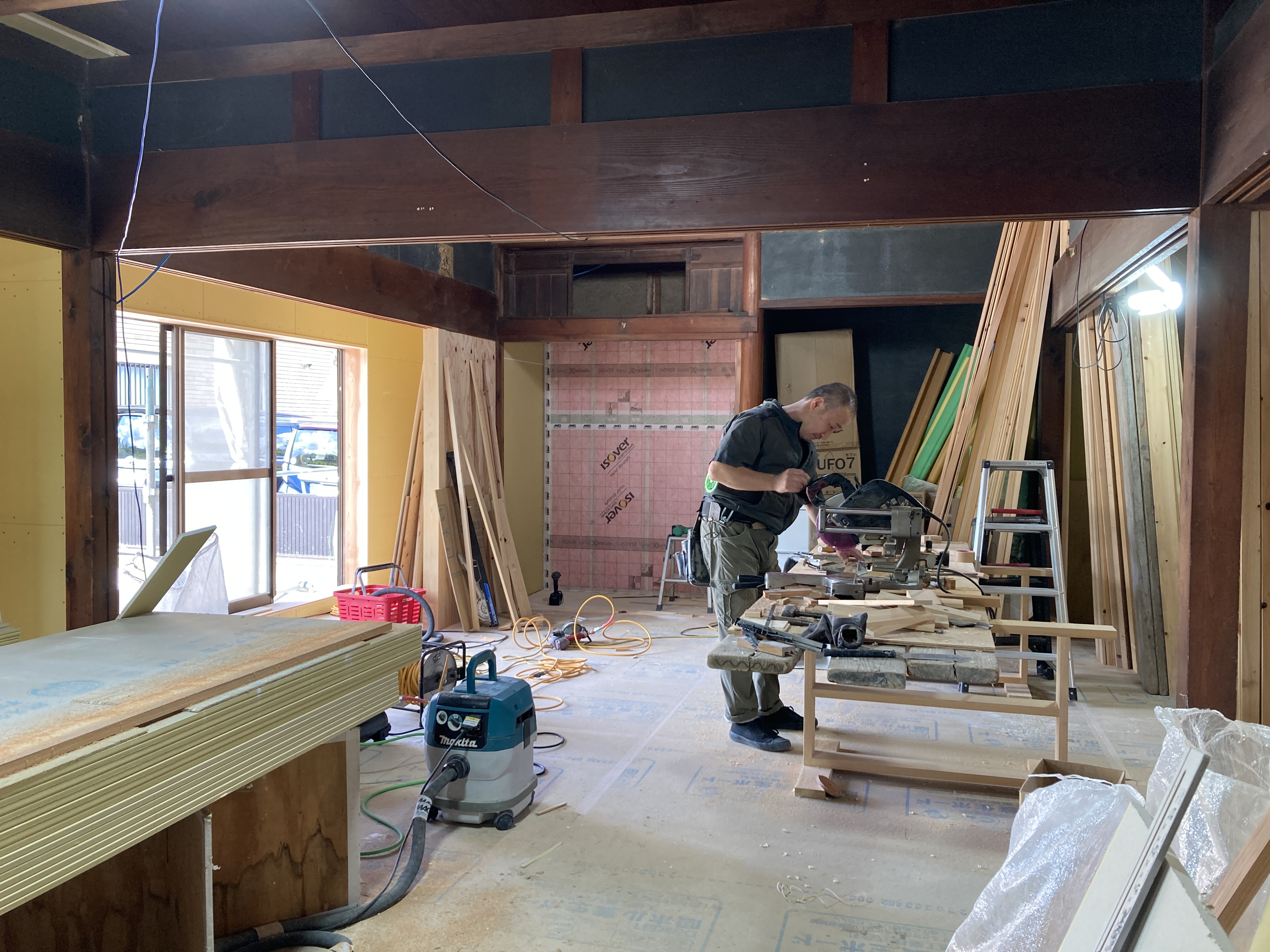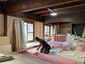 あと2~3年かかりそう(笑)などと冗談を言いながら、断熱材を入れるi井棟梁。新築と違い、改修工事は予期せぬ事が多いので、収まりなどは設計士さんと棟梁がその都度相談しながら進めています。