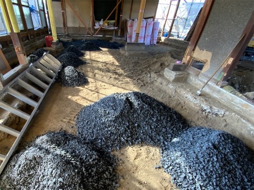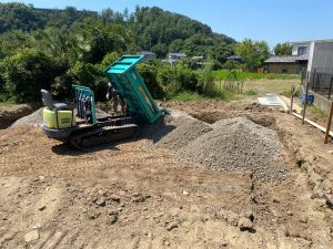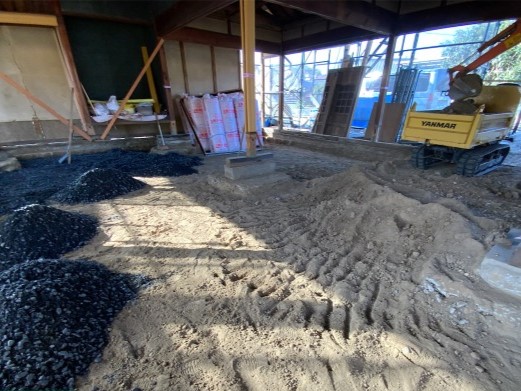 砕石を敷き転圧をかけて、防湿シートを敷き詰めています。