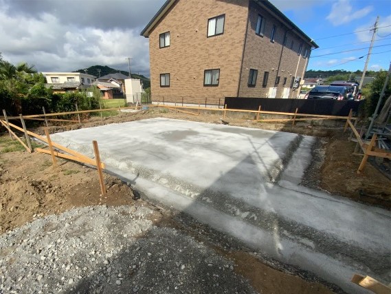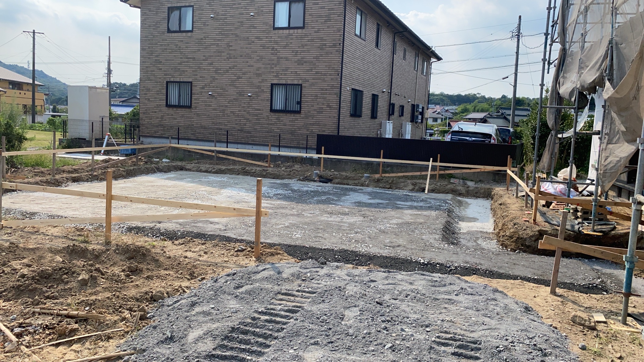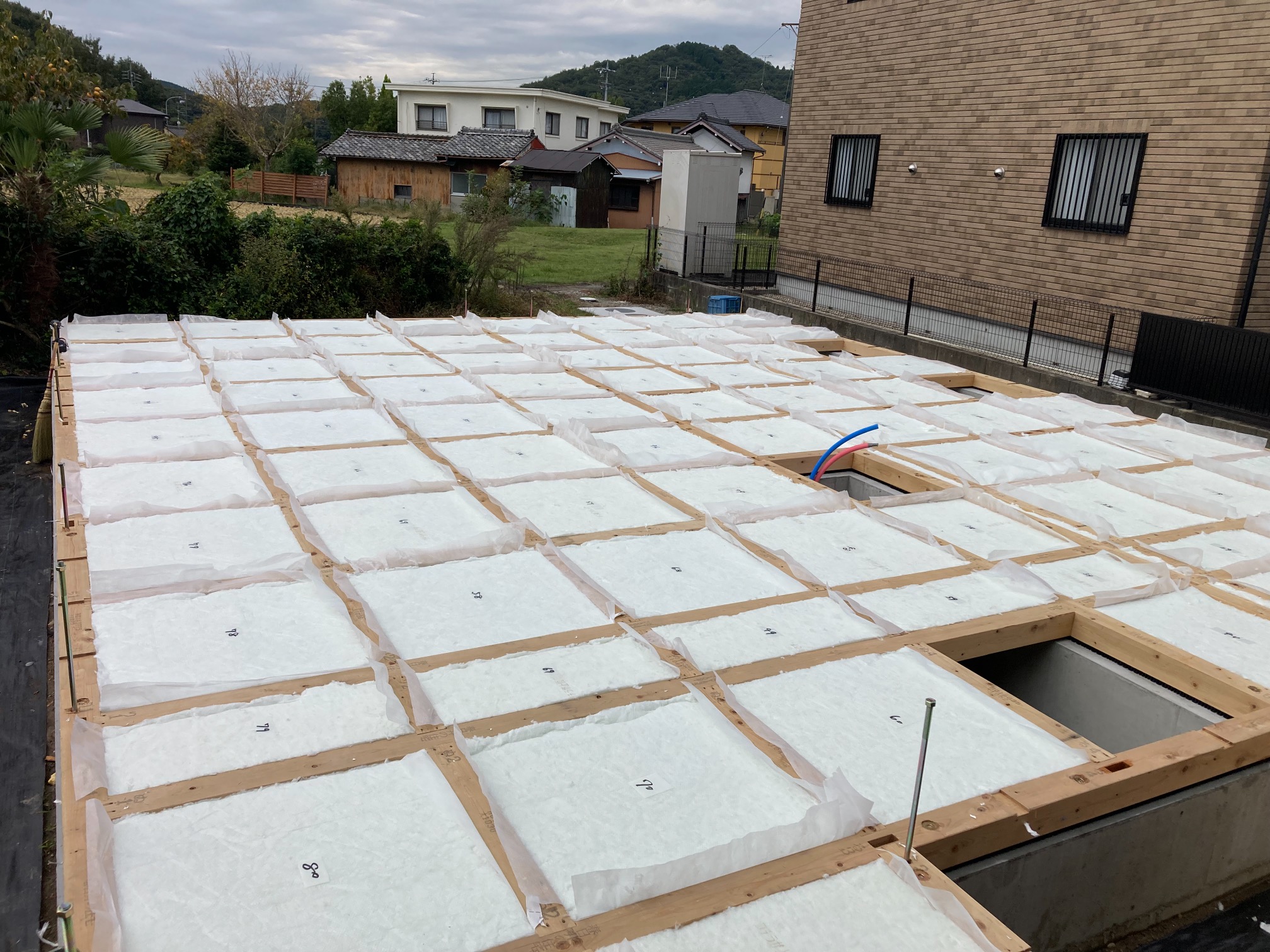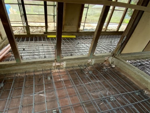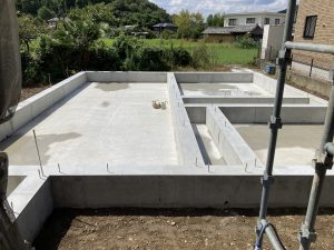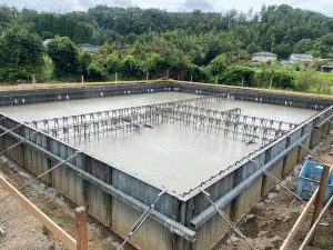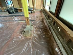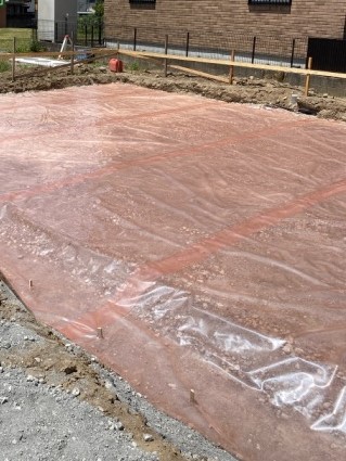 防湿シートを敷いて、捨てコンクリートを打った時の様子です。