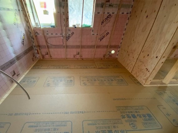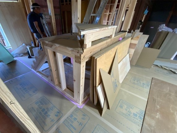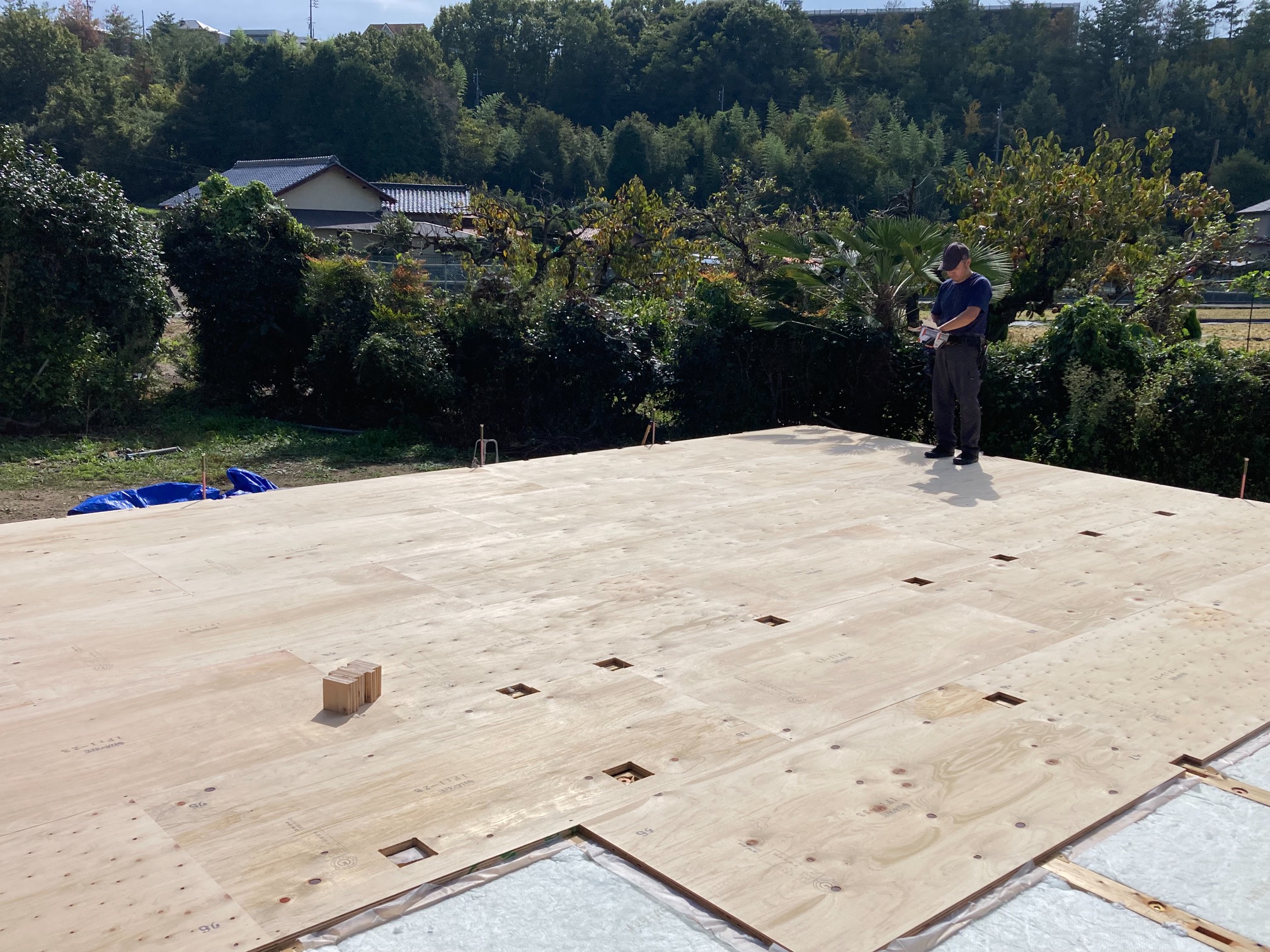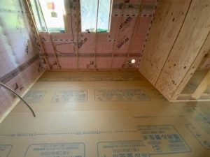 随分間が空いてしまいました💦床の仕上げ材を張り終えて、傷が付かないようにしっかりと養生されました。この養生の色が曲者💦パッと見た感じ、合板と同じような色目なので、現場は進んでいないように見えてしまいます。ここまできたら、後半戦に差し掛かりましたな~棟梁、ガンバ!です。(まだまだ~と言われそう)