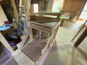 2階へ上がる階段の踊り場でした。i井棟梁、階段の造作に入った様子です。愛弟子のk田君は、大棟梁の現場からそろそそ戻ってきていますかね~?
