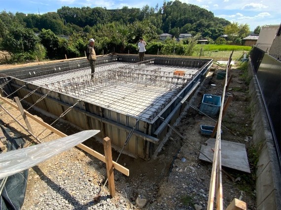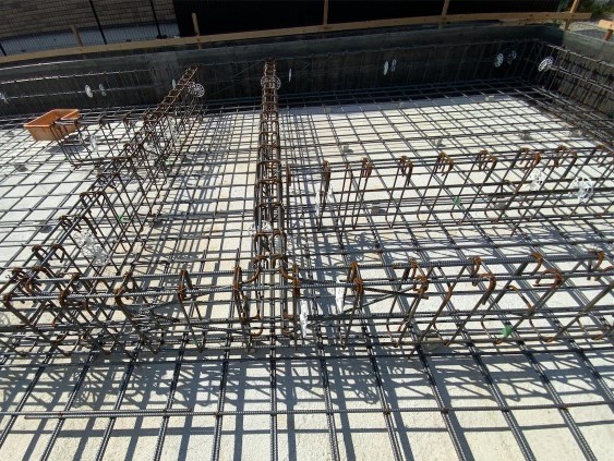 外周の型枠を組み、配筋工事。今回は床断熱の為、この基礎内部は外気で換気することになります。換気は基礎パッキンによって保たれる計画です。また、人通口は設けず床下の点検は区画ごとに床下点検口を設けますので、地中梁が不要です。