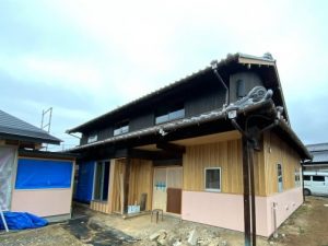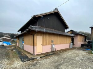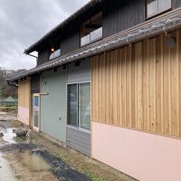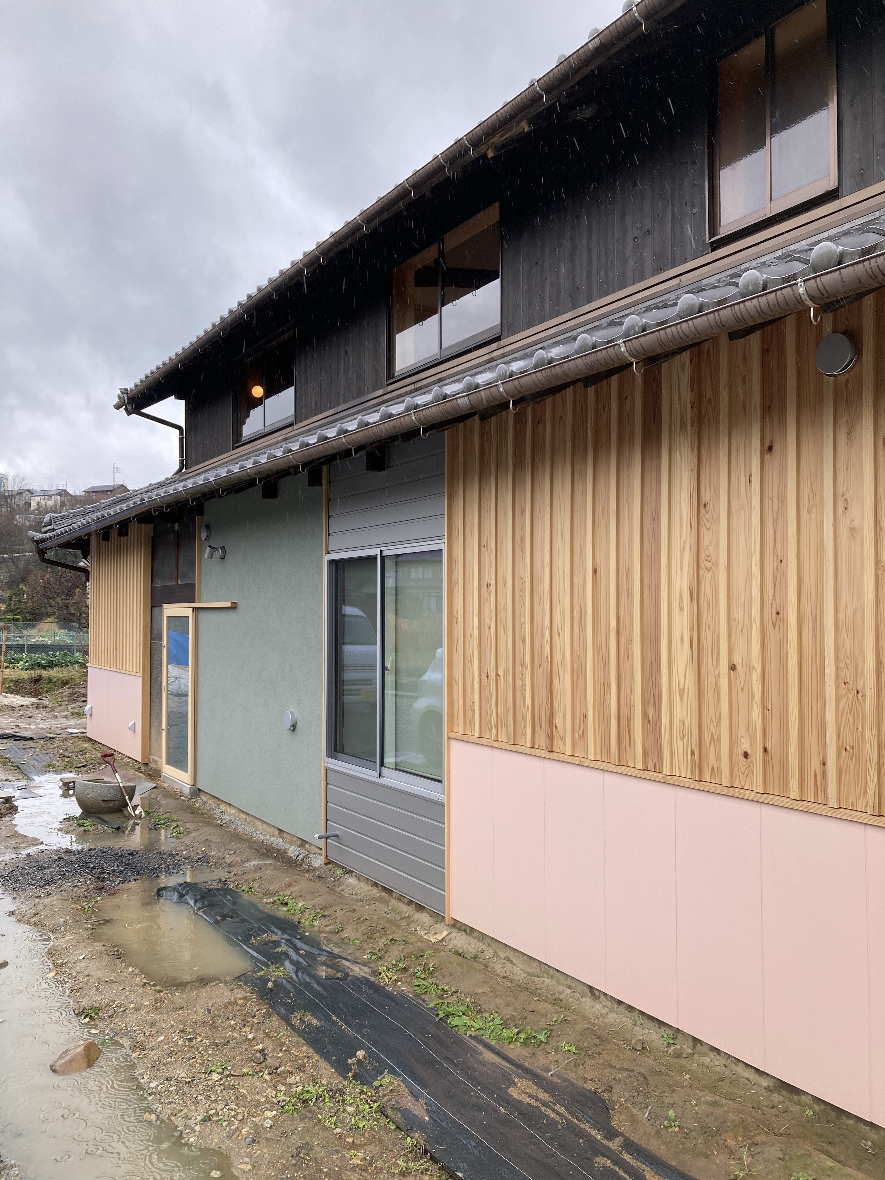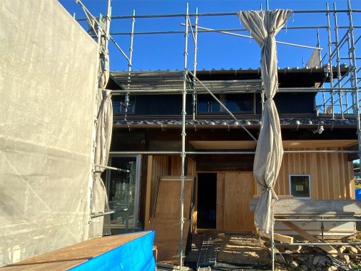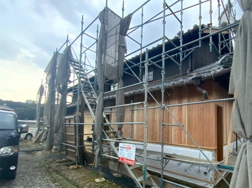 古民家の外壁工事が進んでいます。今回は板張りがあるので、外部の木工事(大工工事)も結構あります。黒と板のコントラストが、とてもいい感じです。