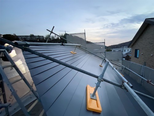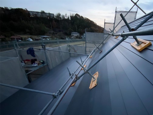 新築棟の屋根が葺き終わっています。複雑な屋根の形に合わせて横葺き。足場が外れるのが楽しみです。