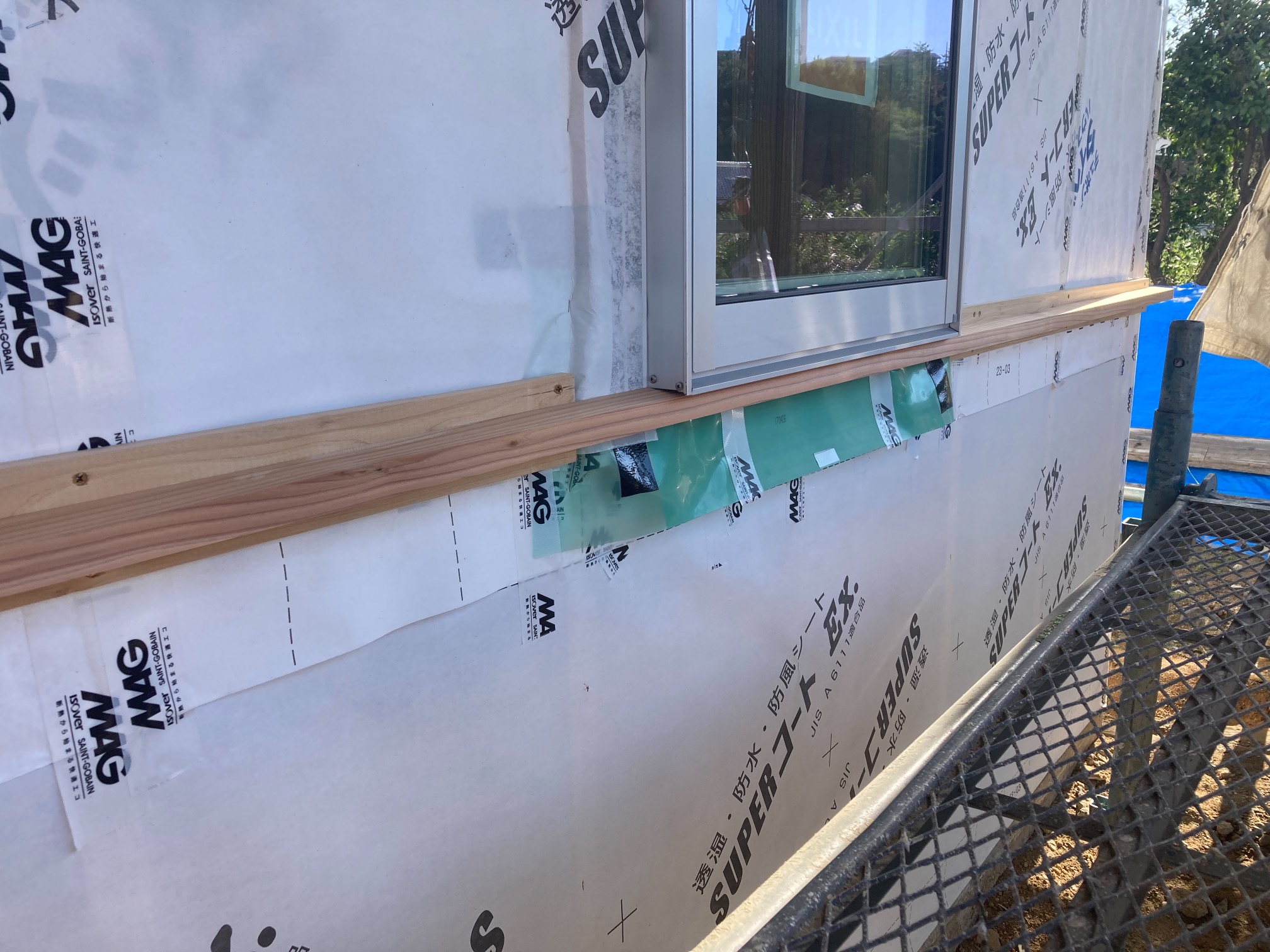 調湿防水シートを張り終えています。外壁の仕上げは、腰までがサイディングで腰上は杉の羽目板押し縁張りです。最近、羽目板の押し縁張り人気です👍