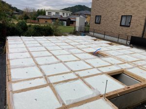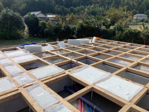 新築棟の上棟日が決まり、昨日土台伏せを行いました。今回は、床断熱。土台、大引き、根太間にすっぽりとはめ込んでいきます。(モデル:i井棟梁・撮影:k田君)