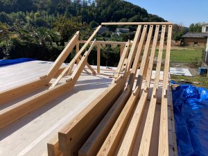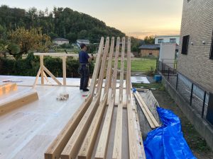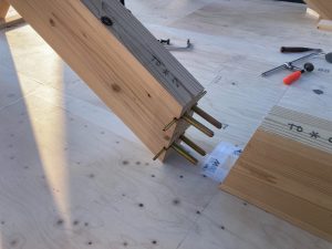 お~!これがi井棟梁がワクワクしていた梁ですね。微妙な角度でジョイントさせるのに、梁を立てかけるための台だったんですね~。どんな形になるのでしょうか?建て方が楽しみです。