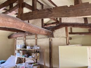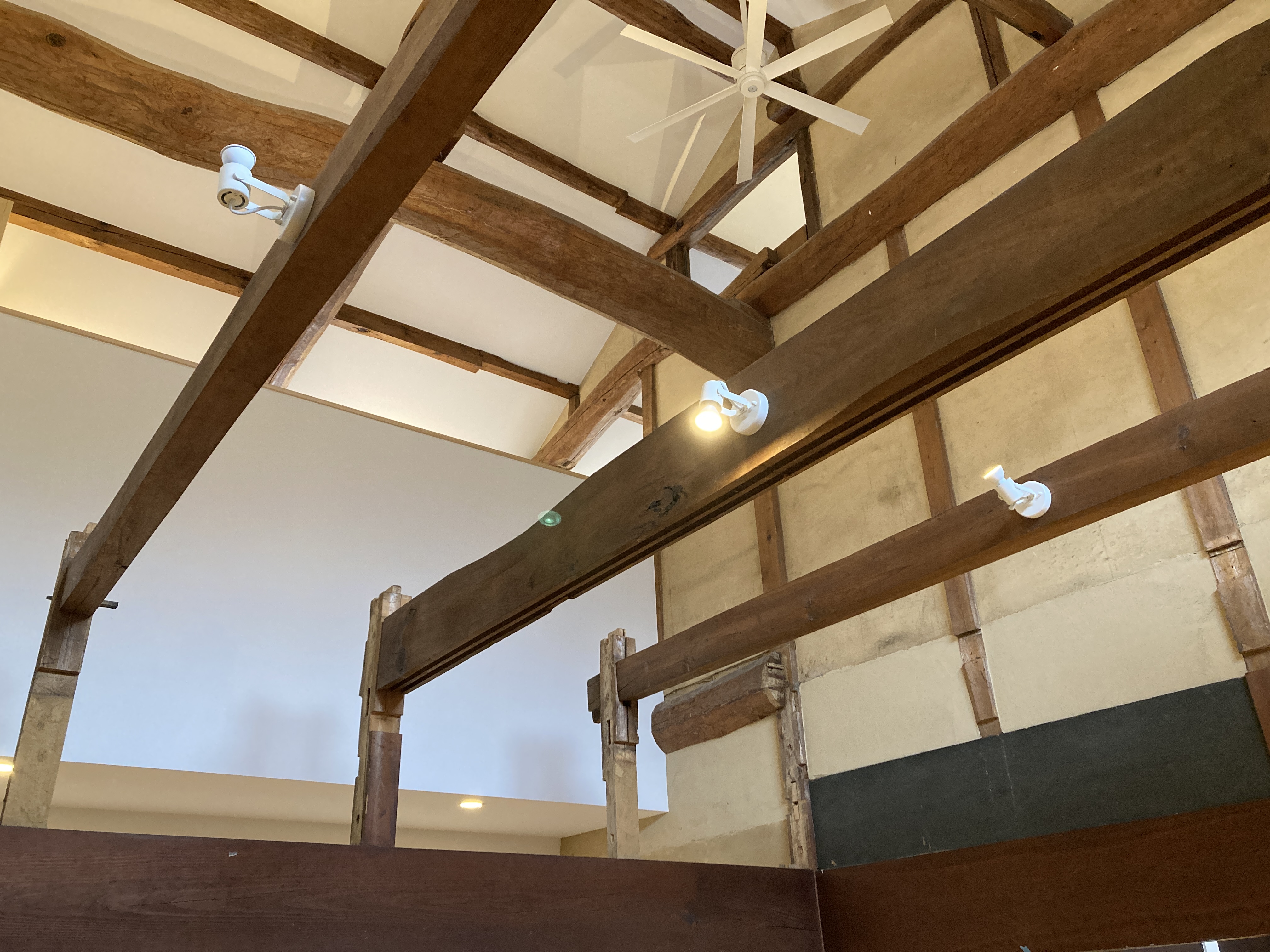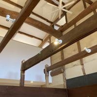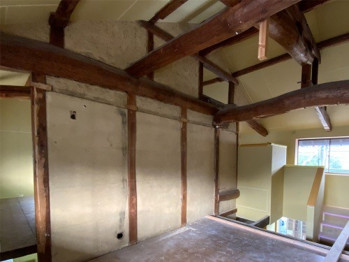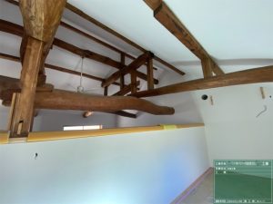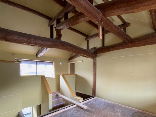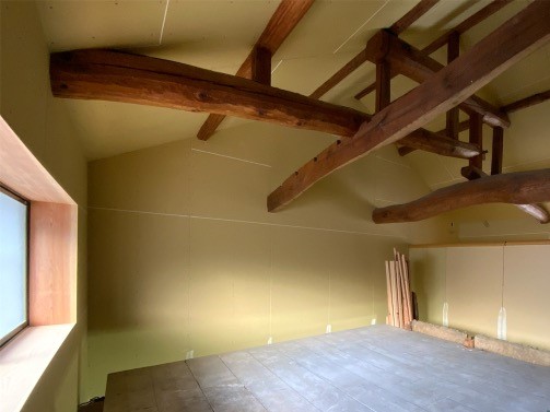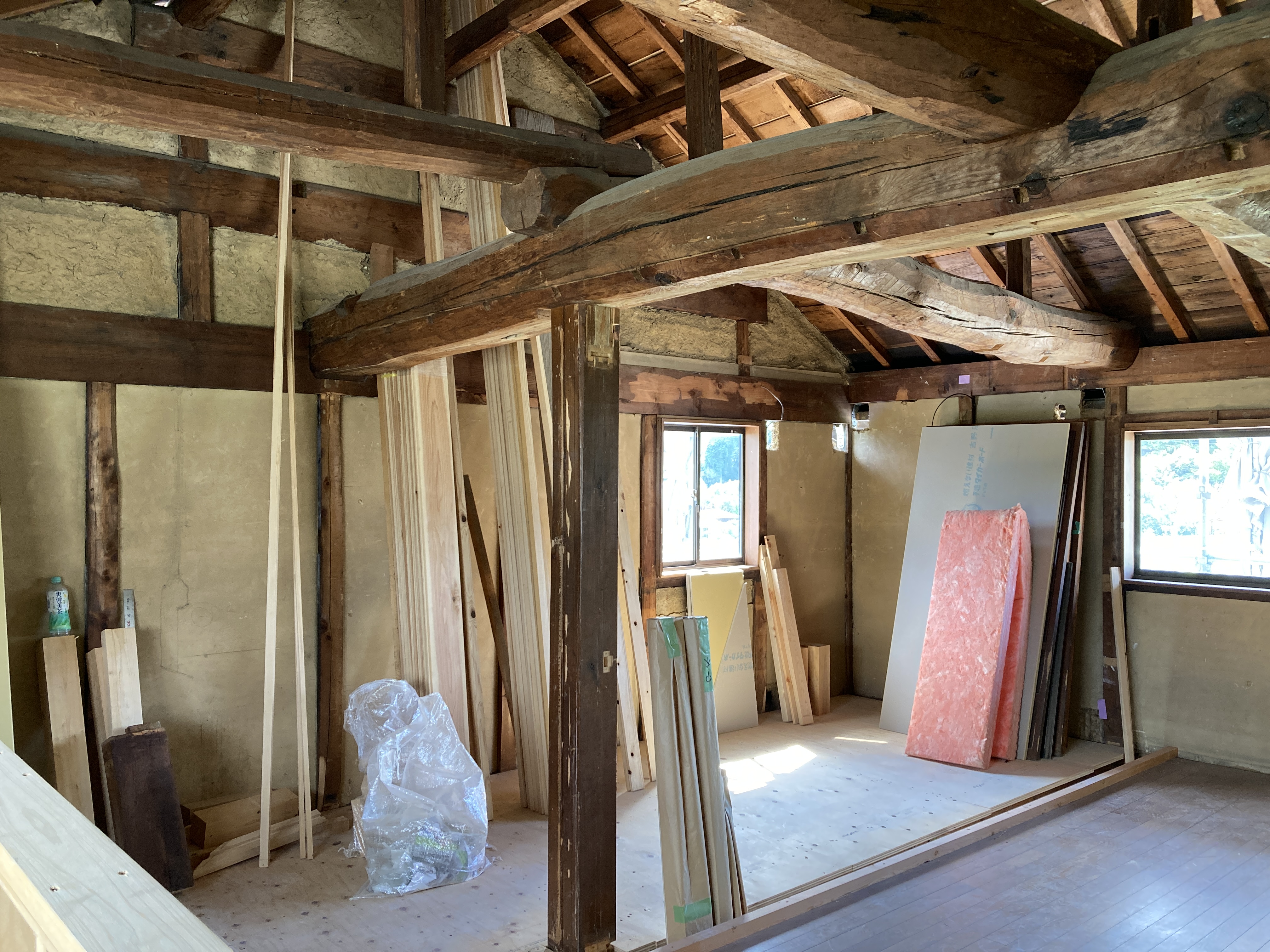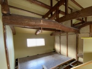 古民家の2階は現在この様になっています。床がある様に見えますが、ほとんどが仮足場で、内装の仕上げ工事が終わり次第外されて大きな空間になります。