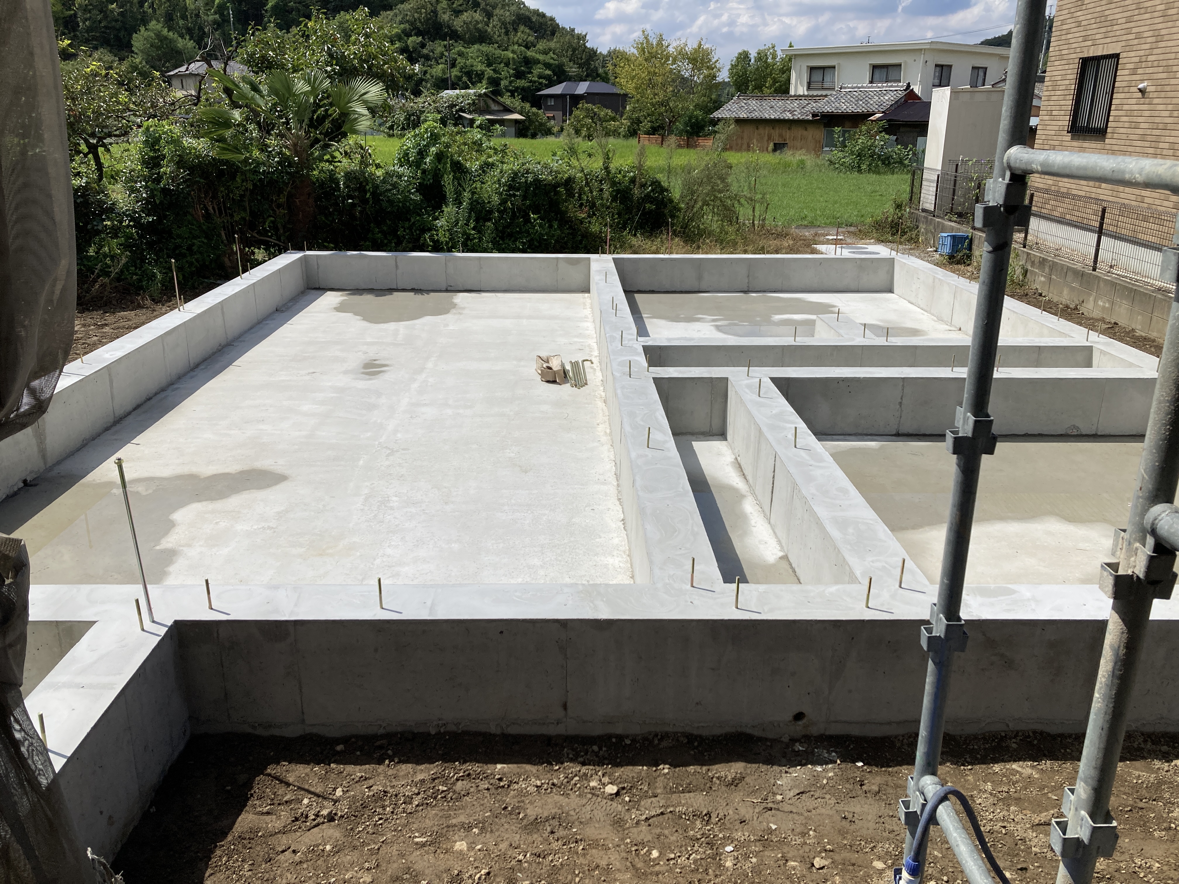 新築工事の基礎が出来上がっています。立ち上がり部分は、主筋、あばら筋、腹筋しっかり入って、仕上がり巾は250。RC造さながらです!i井棟梁曰く、円柱の鉄骨柱に木の登り梁がいくつか集まった構造になるとか。なので、上棟時に丸い鉄骨柱がやってくるそうです。平面計画はとてもシンプルなのですが、立面計画がそんなアグレッシブな造りになっているとは!楽しみですね~