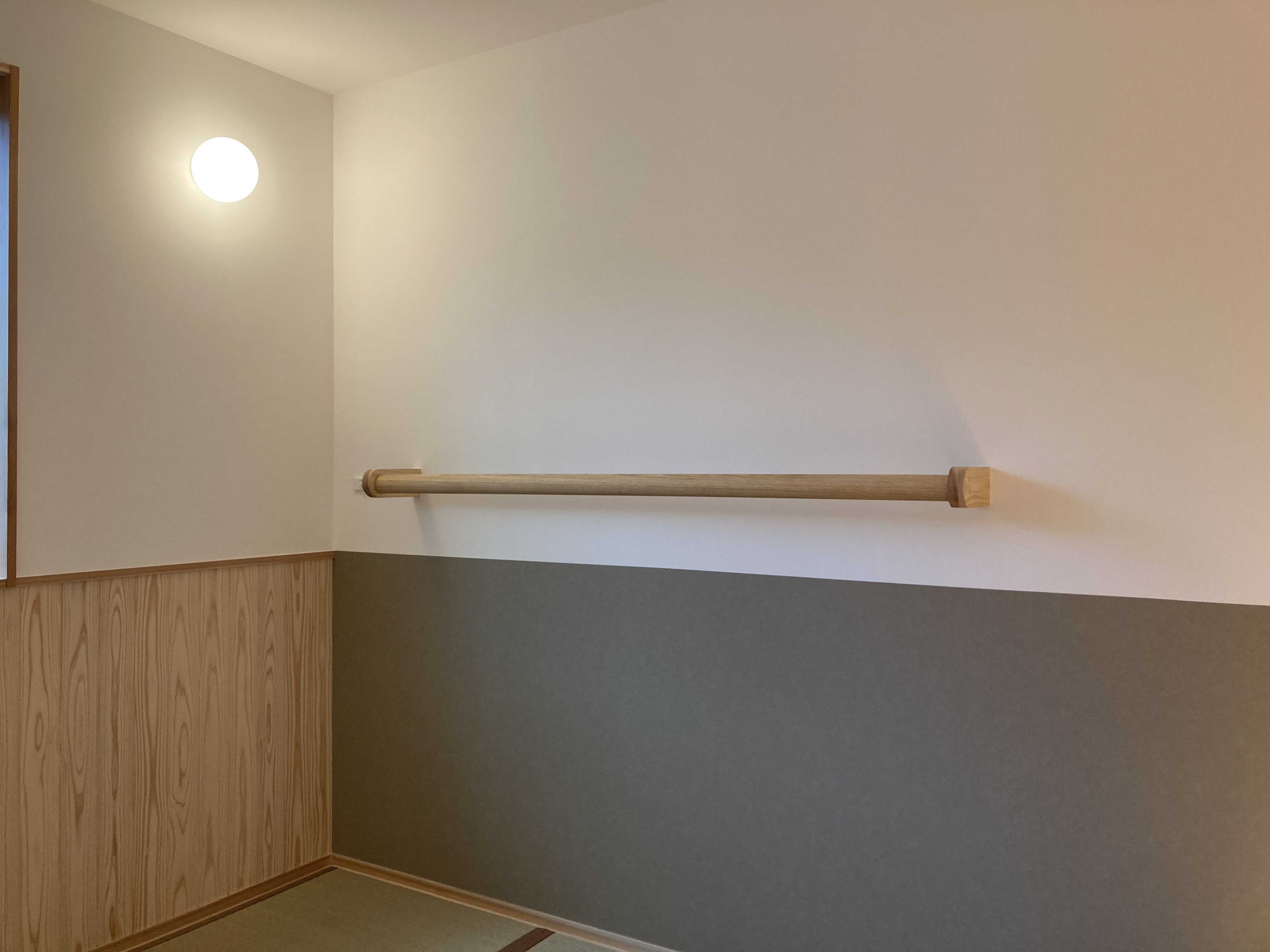 本日は、社内検査にやってきました。新築棟の主寝室は小上がりのタタミ敷です。何やら手すりにしては太いバーが取り付けられています。お布団を掛けておくバーだそうです。寝ている間に、人からコップ一杯の水分が出ると言いますもんね。通気性の悪い押し入れにすぐにいれてしまうより、少し乾かした方が良いので、いいアイディアですね。
