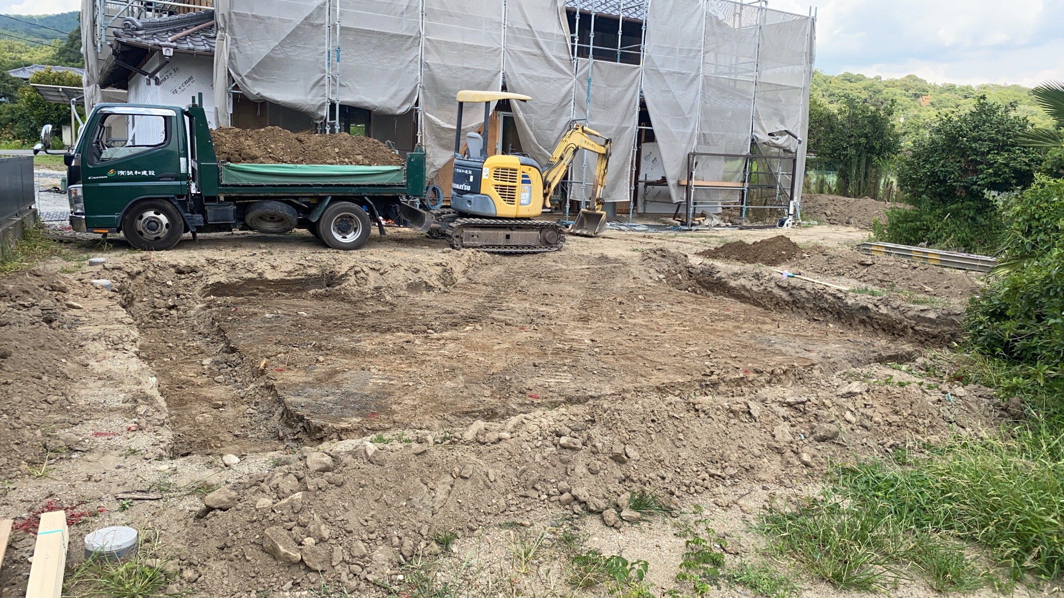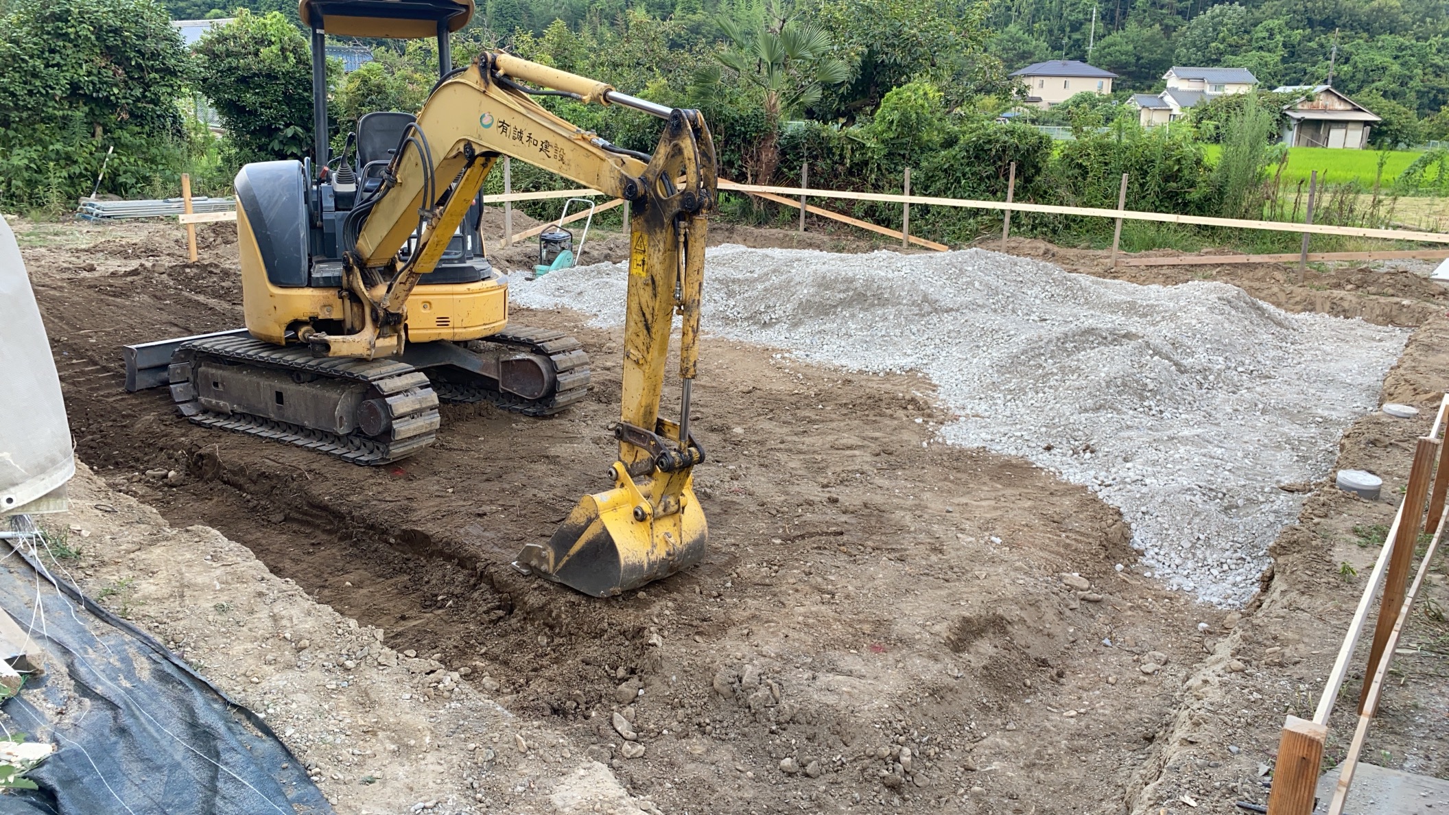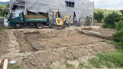 水盛り遣り方(建物の位置出し)をし、掘削をしていきます。